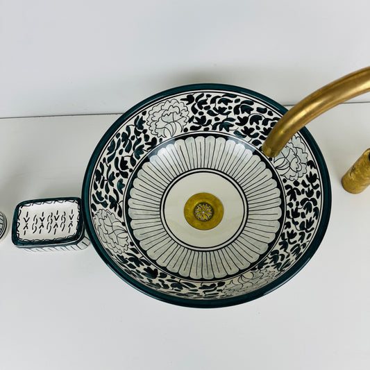 Verdant Bloom: Handcrafted Ceramic Sink with Dark Green Floral Motif