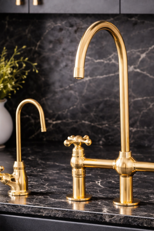 Unlacquered Brass Kitchen Bridge Faucet, 3 Hole Design with Side Sprayer & Cold Water Tap