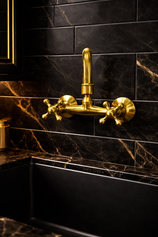 LASSQ Handcrafted Unlacquered Brass Kitchen Faucet, Wall Mounted