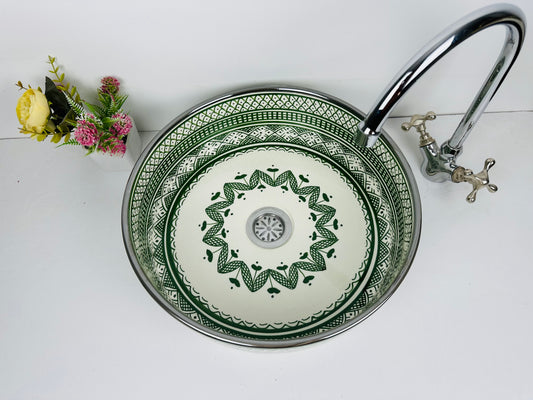 Woodland Elegance: Handcrafted Ceramic Sink with Traditional Forest Green Color and silver platinum