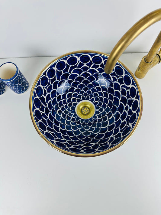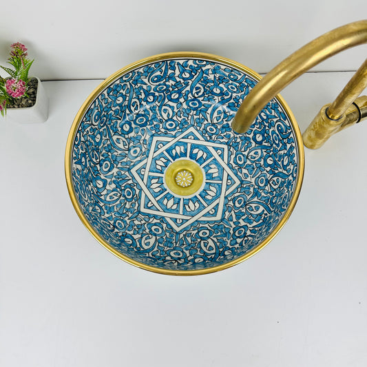 Handcrafted Blue Ceramic Sink with Gold Accents