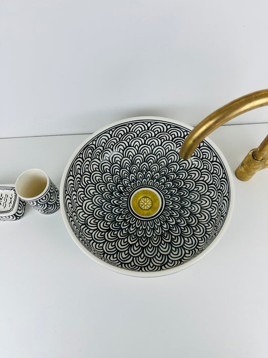 Inkwell Creations: Handcrafted Ceramic Sink with artisanal Black Shapes and brass touch