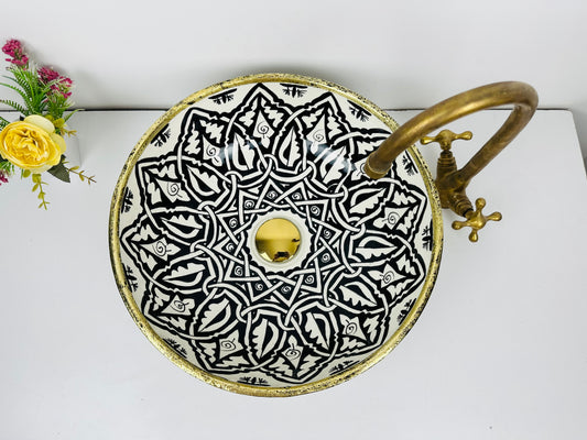 Timeless Classic: Handcrafted Ceramic Sink in Black and White Traditional Style with Brass