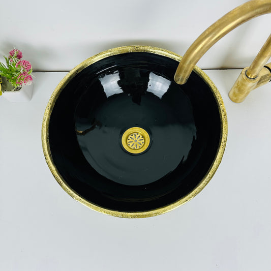 Round Handcrafted Ceramic Sink - Midnight Black with Gold Brass