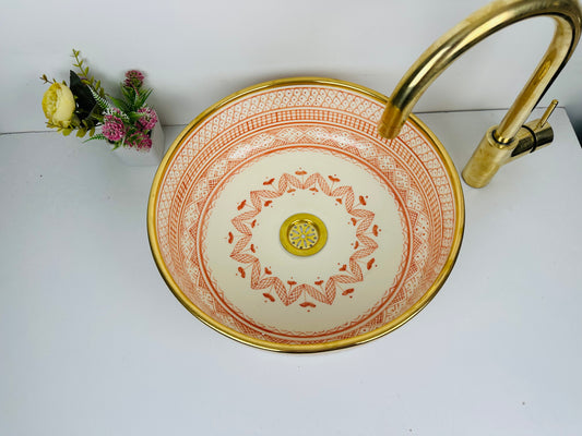 Timeless Elegance: Handcrafted Light Orange Ceramic Sink with Brass Accents