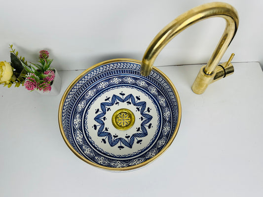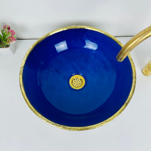 Royal Navy 14K gold : Handcrafted Ceramic Sink with Traditional Hand-Painted Navy Blue Design