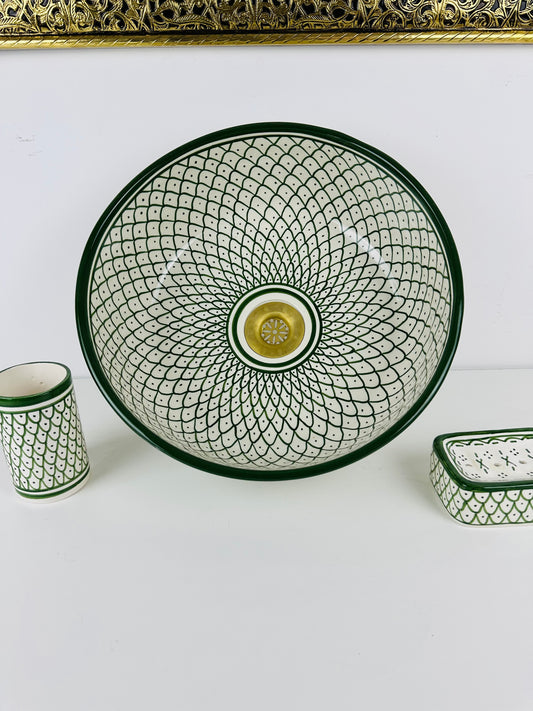14k gold Emerald Xscape: Handcrafted Ceramic Sink with X-Shaped Designs in Green