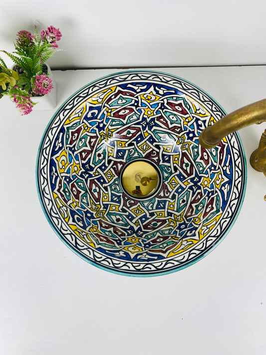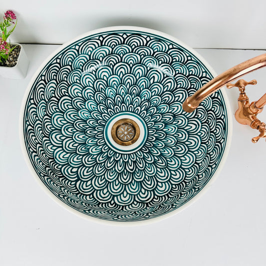 Black & White Moroccan Ceramic Sink with Brass Rim