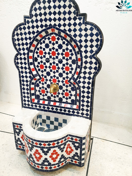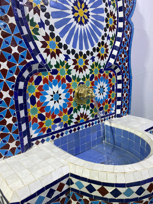 Moroccan Zellige Mosaic Fountain – Red, Blue & White Pattern