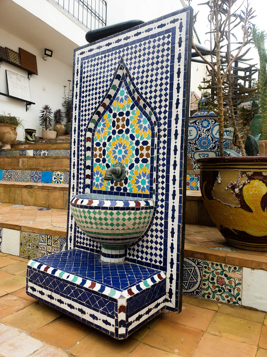 Handcrafted Moroccan Zellige Fountain – Blue & Multicolor Mosaic