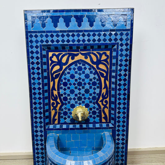 Handcrafted Moroccan Zellige Fountain – Blue & Gold Elegance