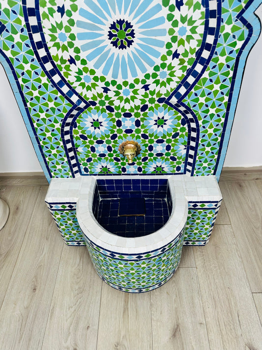 Handcrafted Moroccan Zellige Fountain – Green & White Elegance