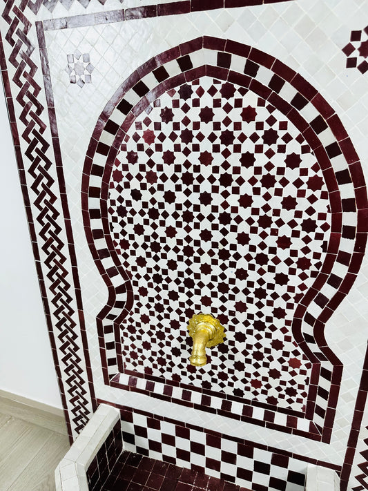 Handcrafted Moroccan Zellige Fountain – Elegant Red & White Geometric Design