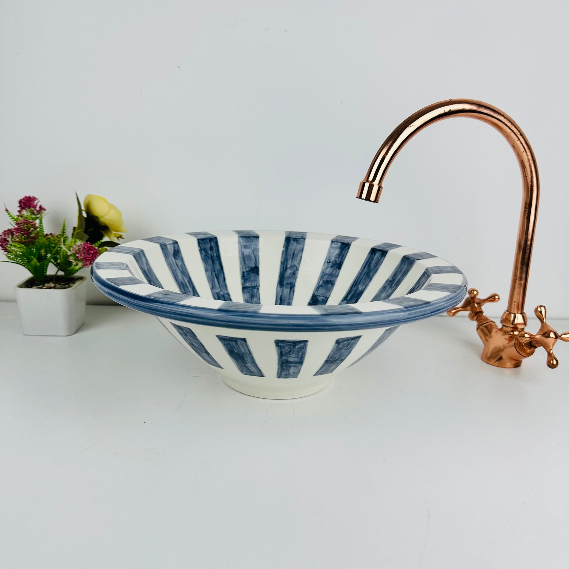 Realce la decoración de su baño con el diseño vibrante del lavabo Ocean Breeze Vessel, que presenta rayas atrevidas pintadas a mano en azul marino y blanco que imitan el atractivo fresco y nítido de la vida costera. El efecto azul jaspeado dentro de cada raya agrega encanto artístico, perfecto para espacios modernos, náuticos o de temática playera. Su acabado suave y esmaltado brinda durabilidad y fácil limpieza al mismo tiempo que crea una pieza central impresionante.