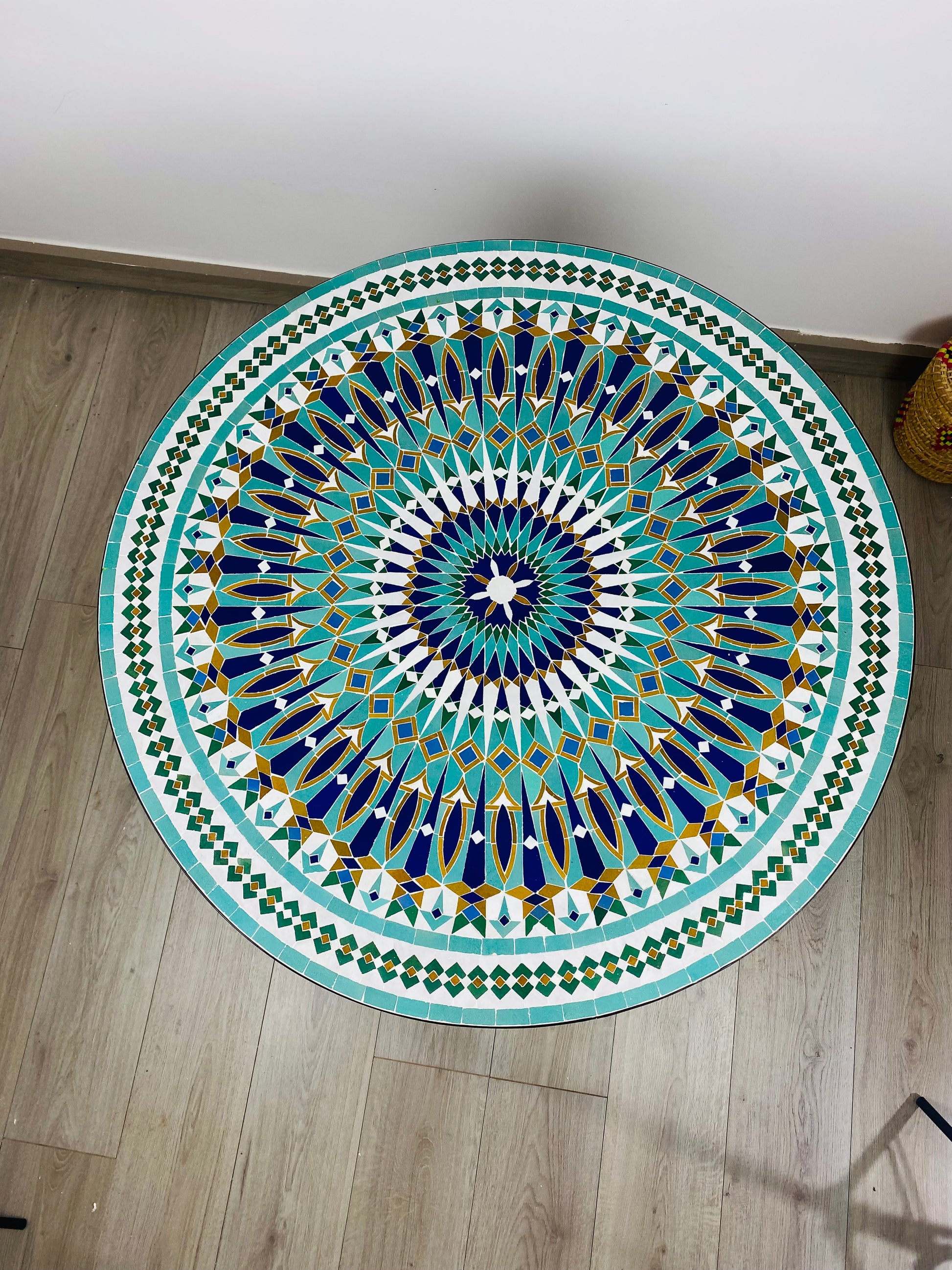 Table Marrakech ronde en mosaïque pour extérieur-intérieur Carreaux marocains 100% artisanaux, Table basse en mosaïque du milieu du siècle. cette belle et puissante table est idéale pour l'extérieur et l'intérieur, le jardin, la maison de plage, le balcon, la causeuse, la terrasse, la table nue, la table de cocktail, l'hôtel, le restaurant... La mosaïque/les carreaux sont faciles à nettoyer et insensibles à l'eau