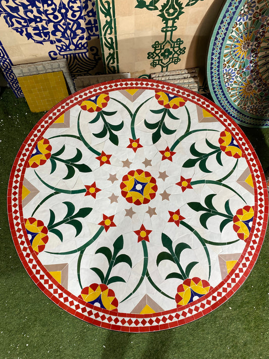 Handmade Moroccan Zellige Mosaic Table – Floral Elegance with Red & Gold Accents
