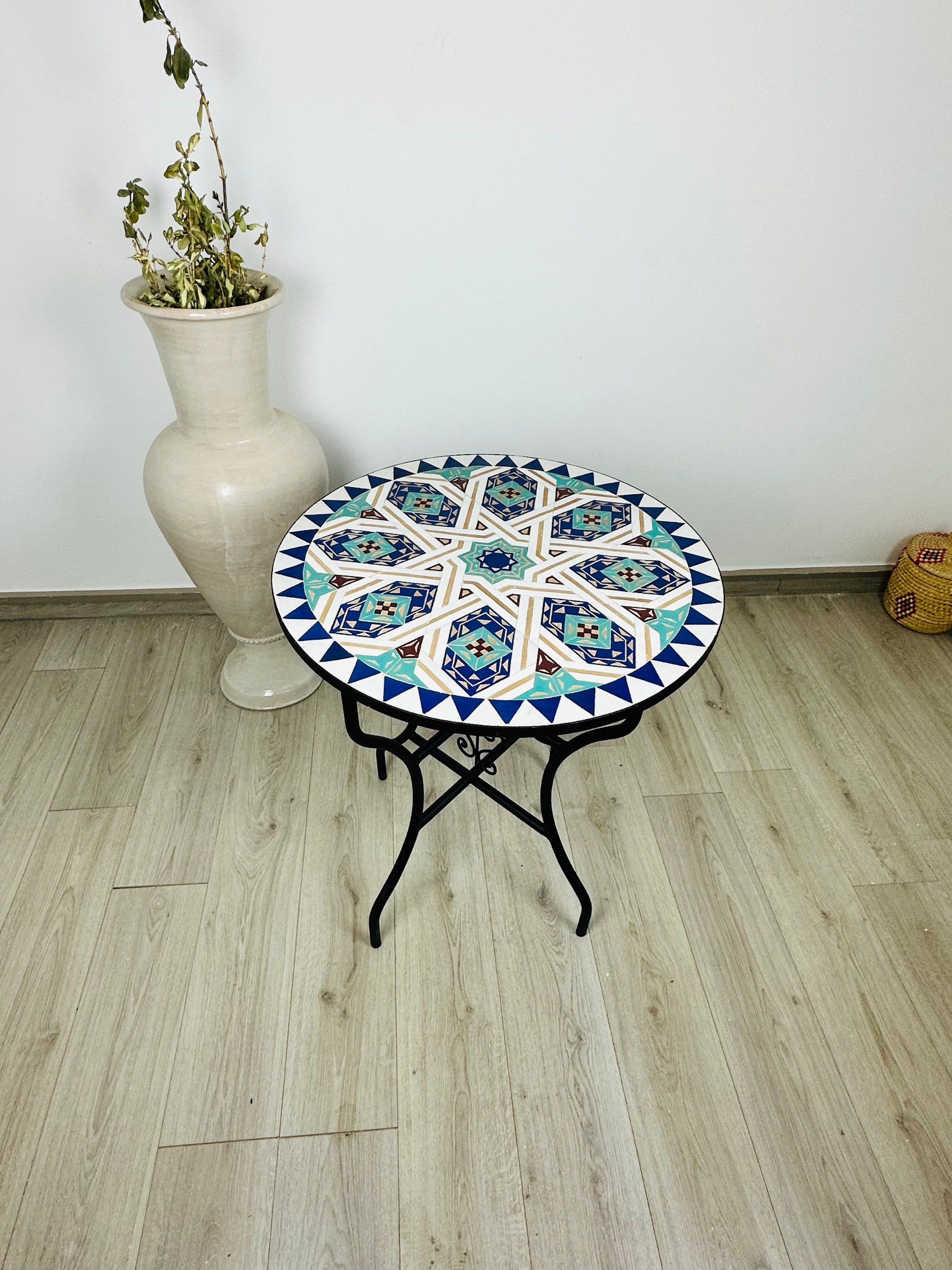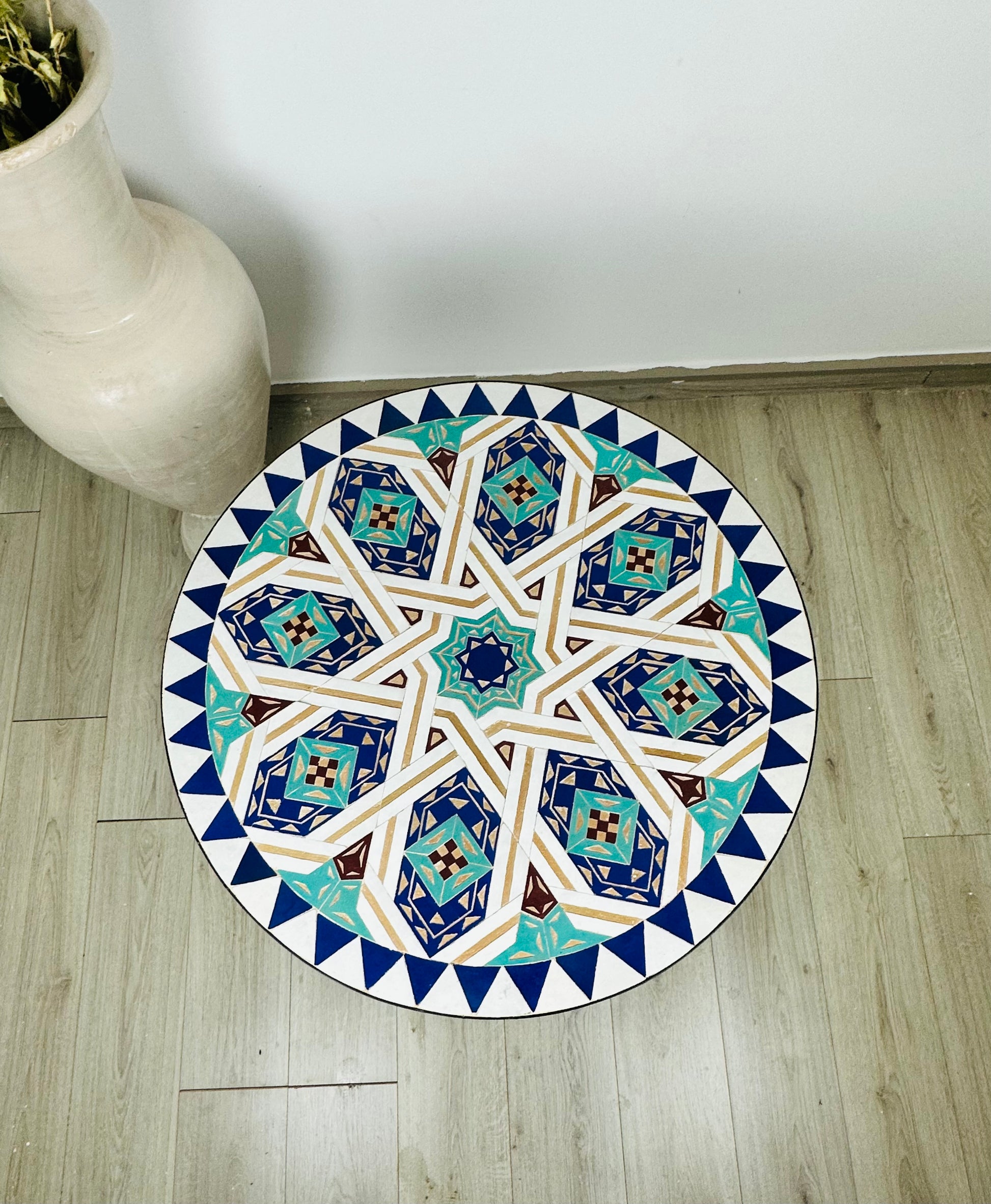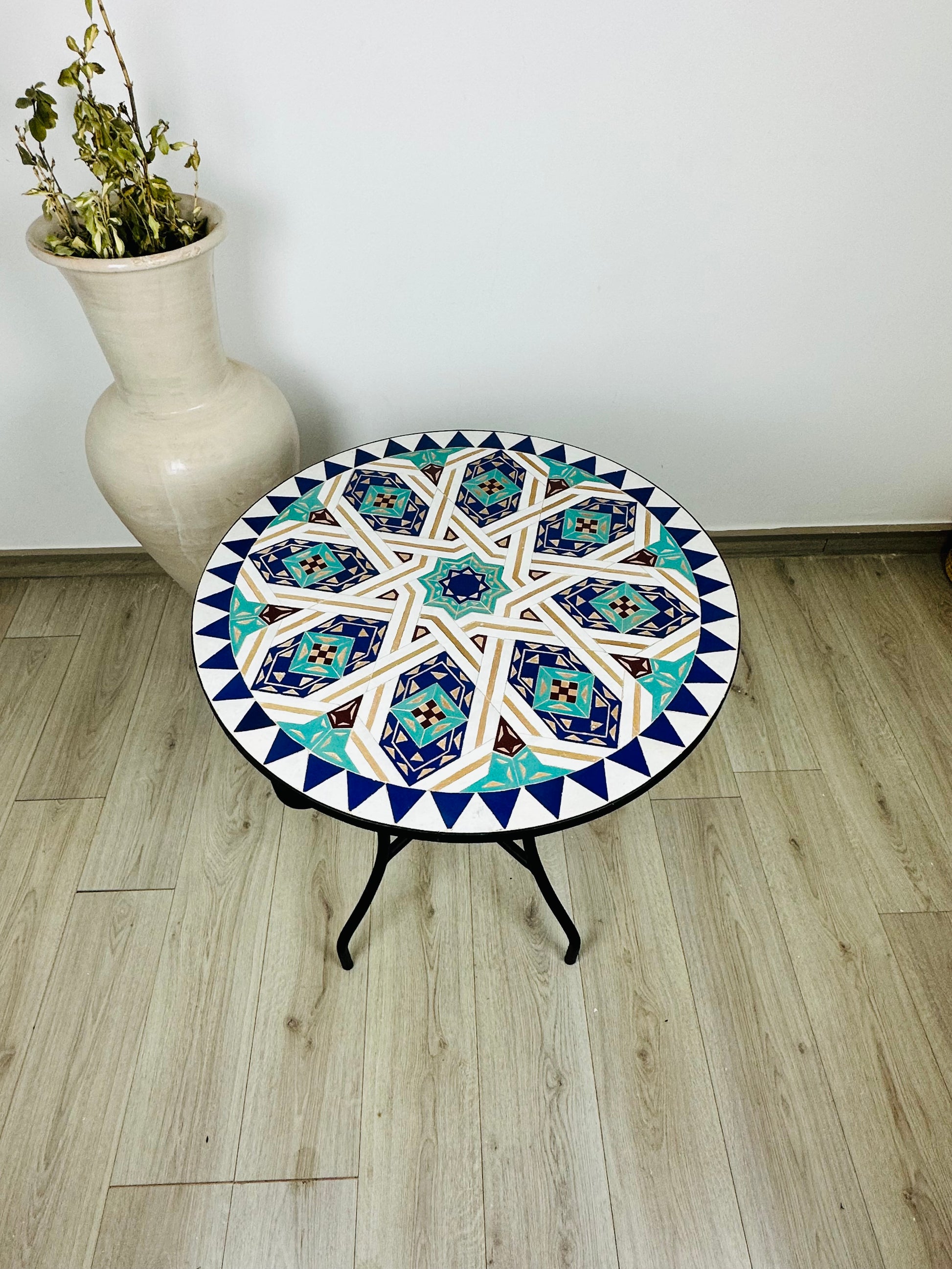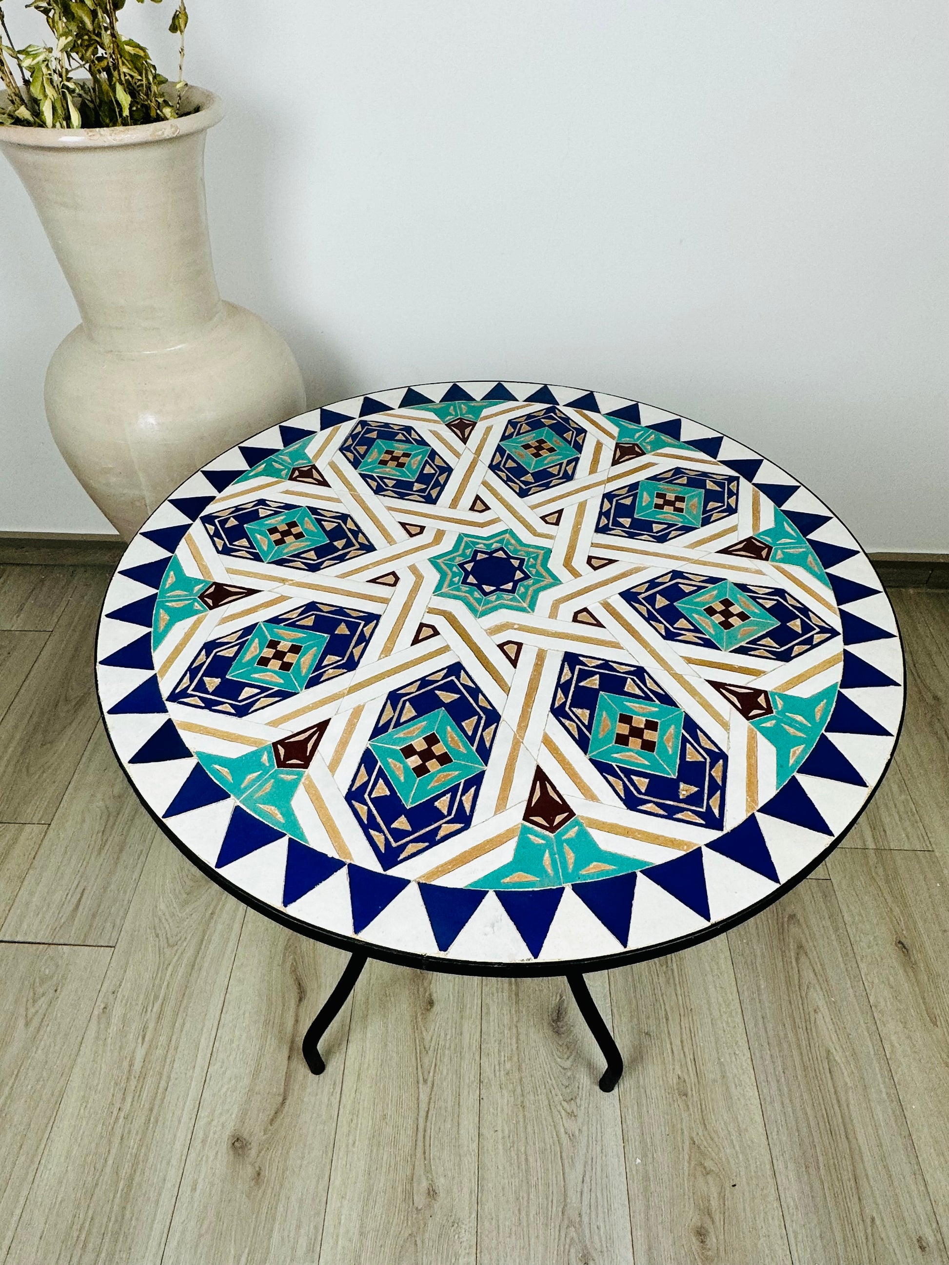 Elevate your space with the Royal Andalusian Mosaic Table, a stunning piece of handcrafted artistry inspired by the intricate geometric designs of Moorish and Andalusian architecture. Featuring an elegant star motif, this table blends deep blues, earthy browns, and soft turquoise hues with a bold triangular border, creating a mesmerizing centerpiece for any space.