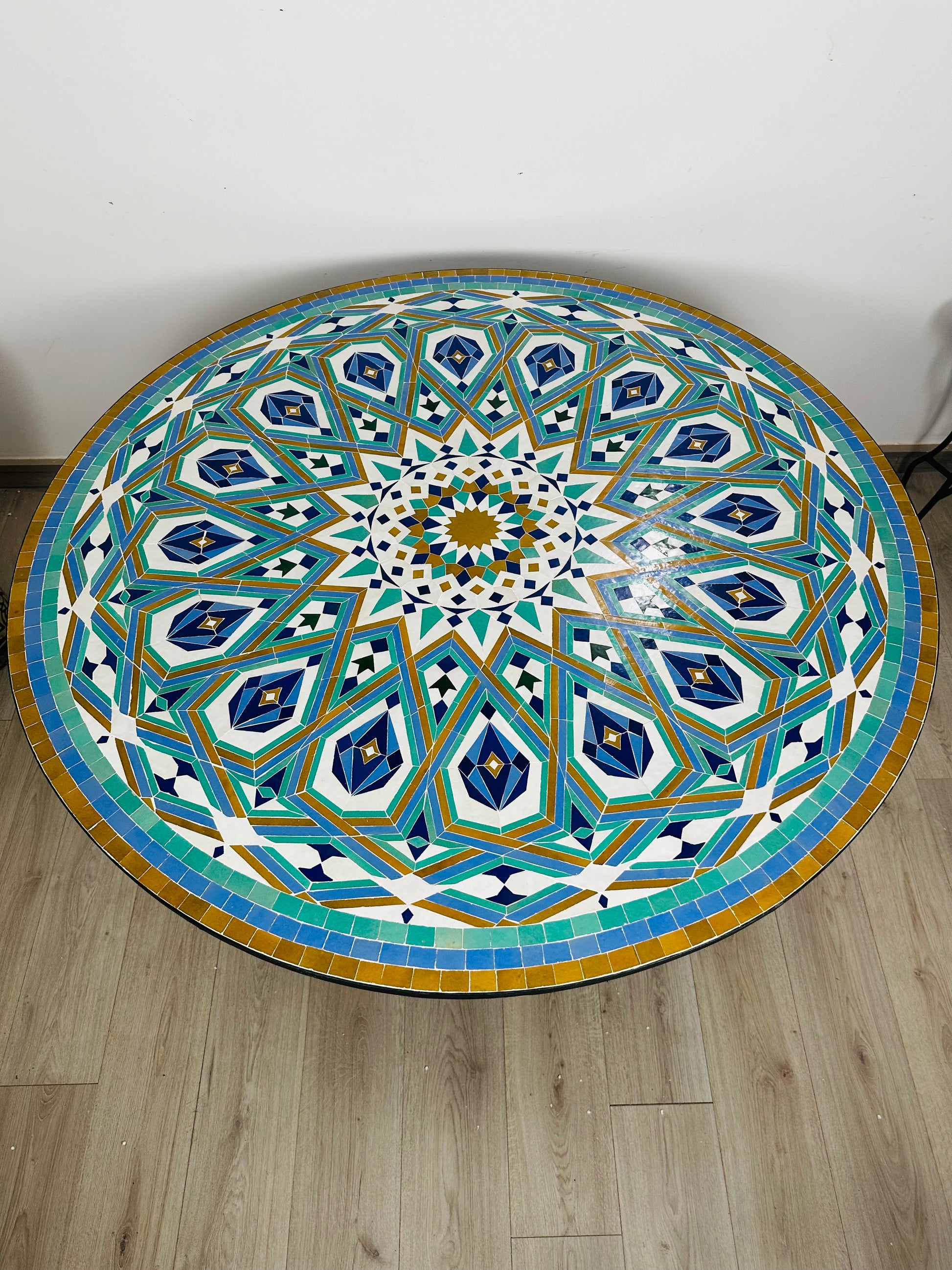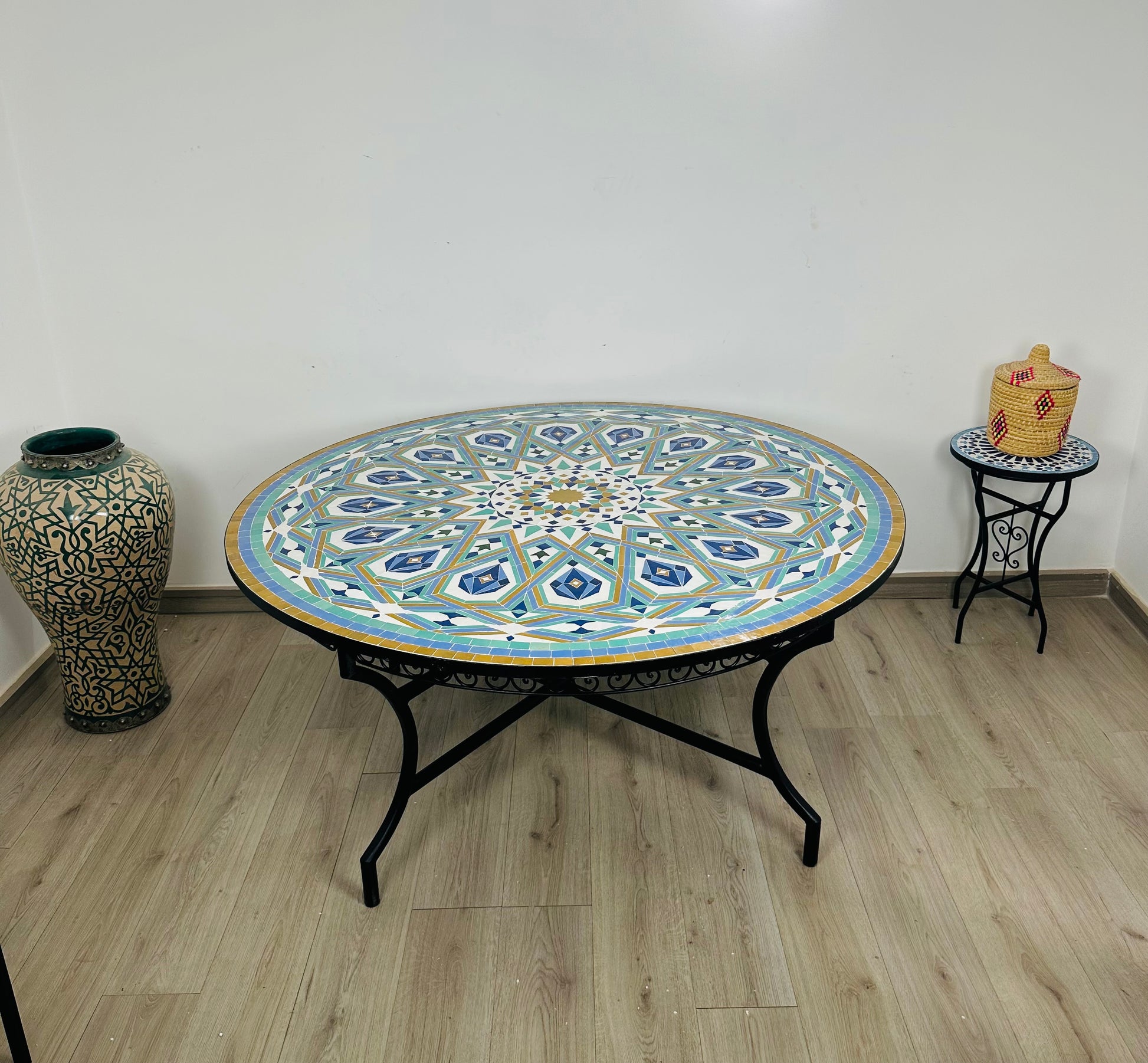 A true masterpiece of Moroccan craftsmanship, the Imperial Mandala Mosaic Table is an exquisite blend of intricate geometric design and vibrant colors. Inspired by traditional zellige artistry, the radiating starburst pattern in shades of deep blue, turquoise, white, and golden yellow creates a mesmerizing visual effect, making this table an instant focal point in any space. The harmonious symmetry and bold contrasts reflect the beauty of centuries-old mosaic traditions.