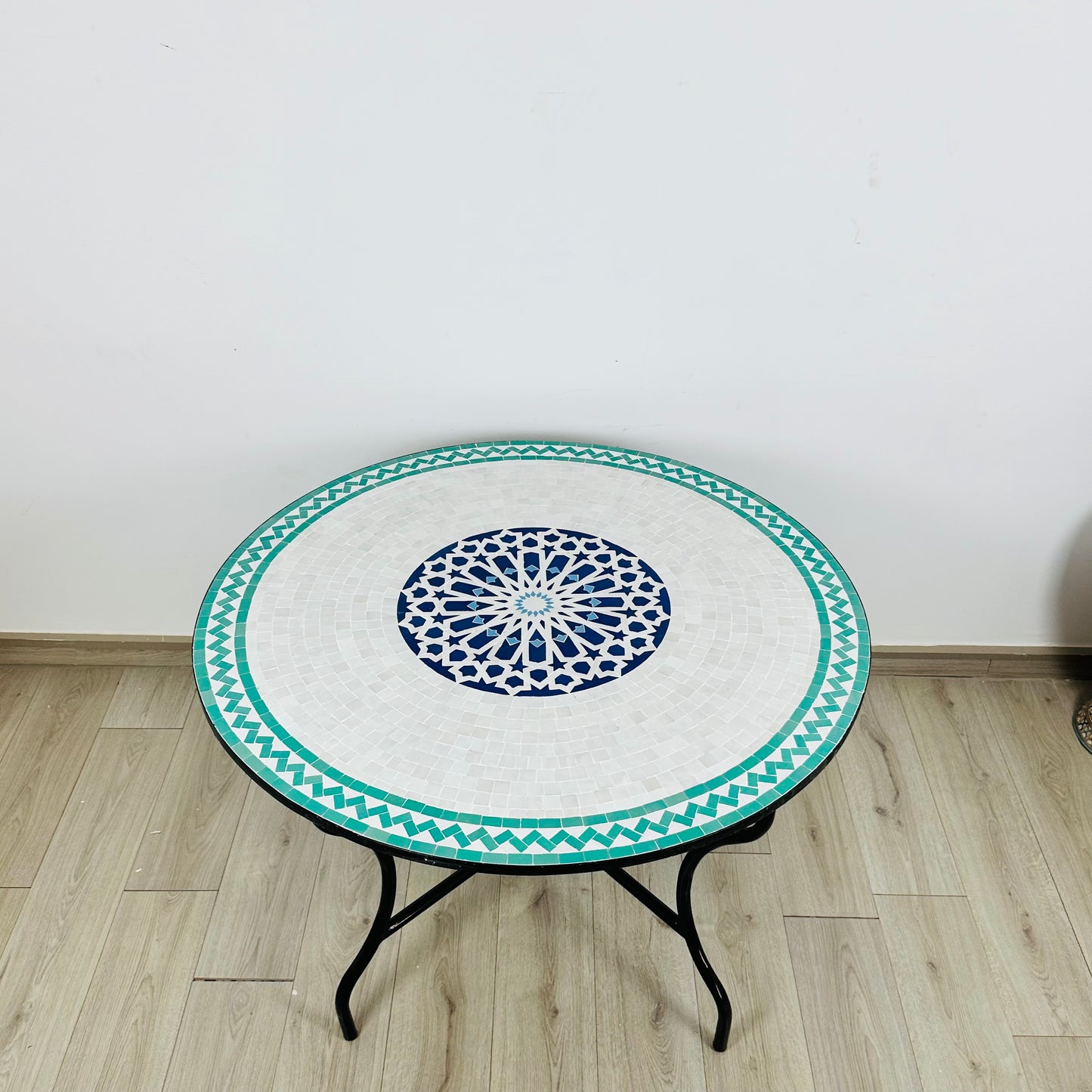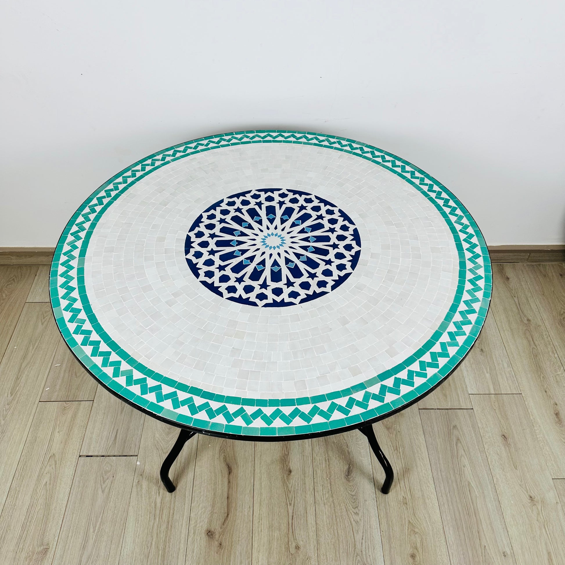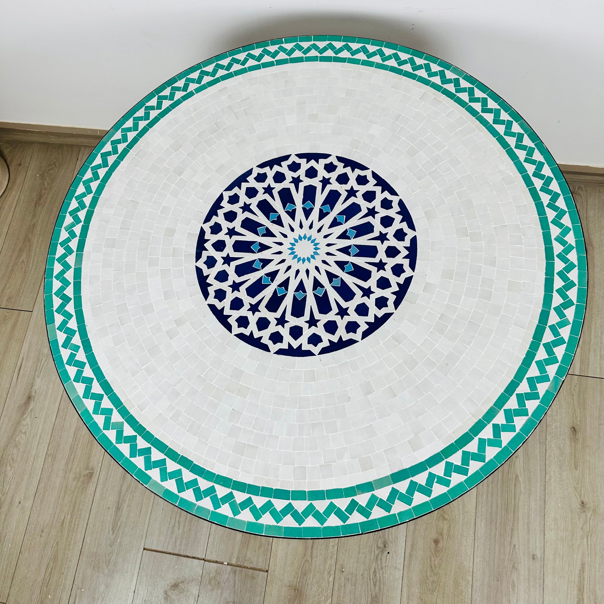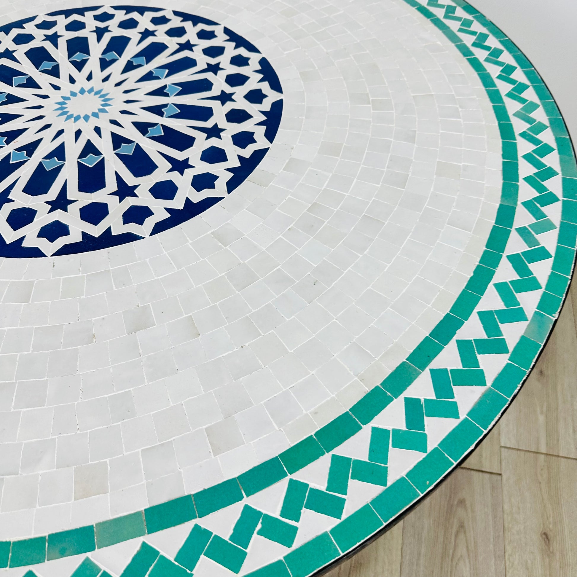 The Serene Elegance Mosaic Table embodies tranquility and sophistication with its minimalist yet striking design. A delicate starburst medallion in deep navy blue sits gracefully at the center, encircled by a pristine white mosaic background and a refreshing turquoise border. This refined contrast creates a balanced and airy aesthetic, making it a perfect addition to both modern and traditional spaces.