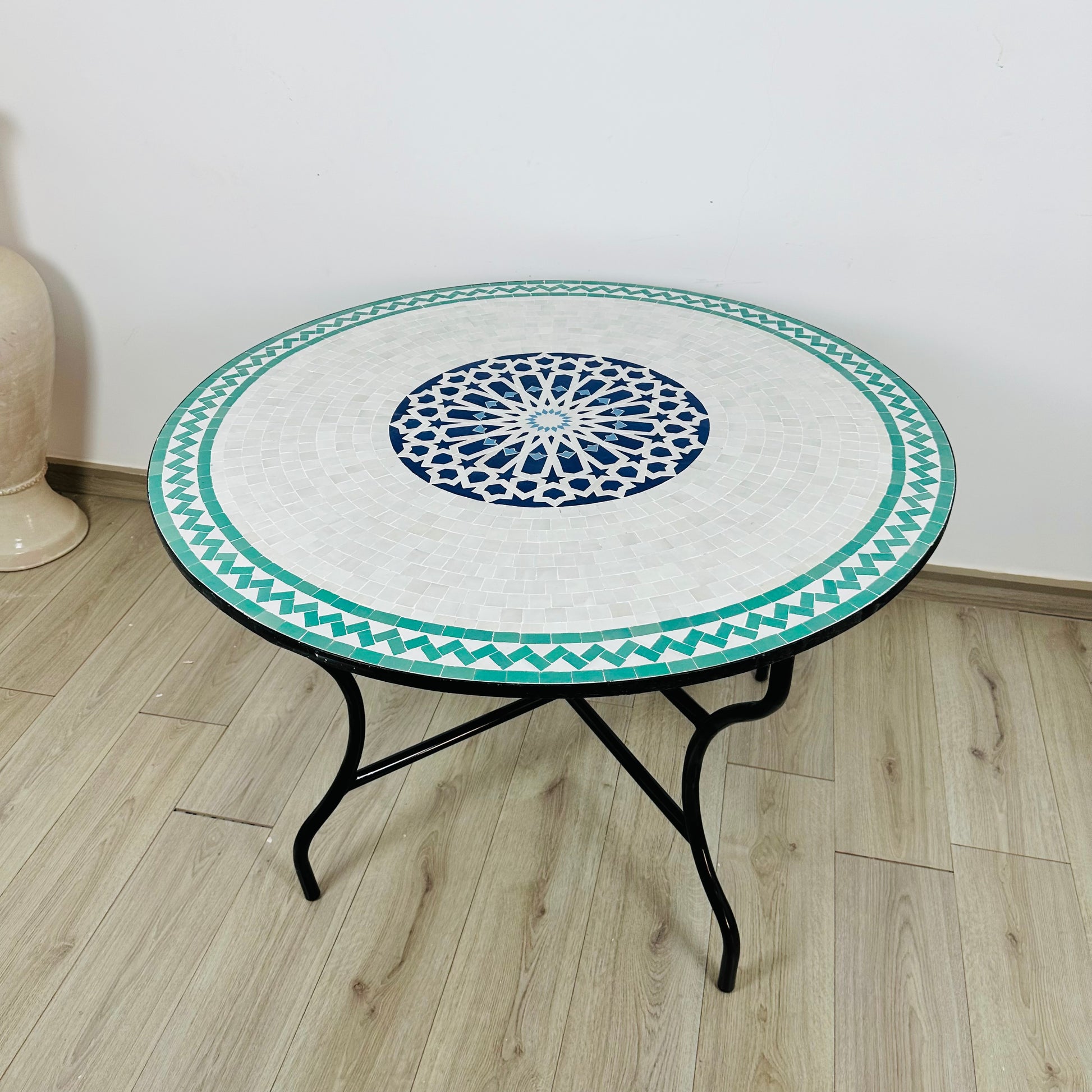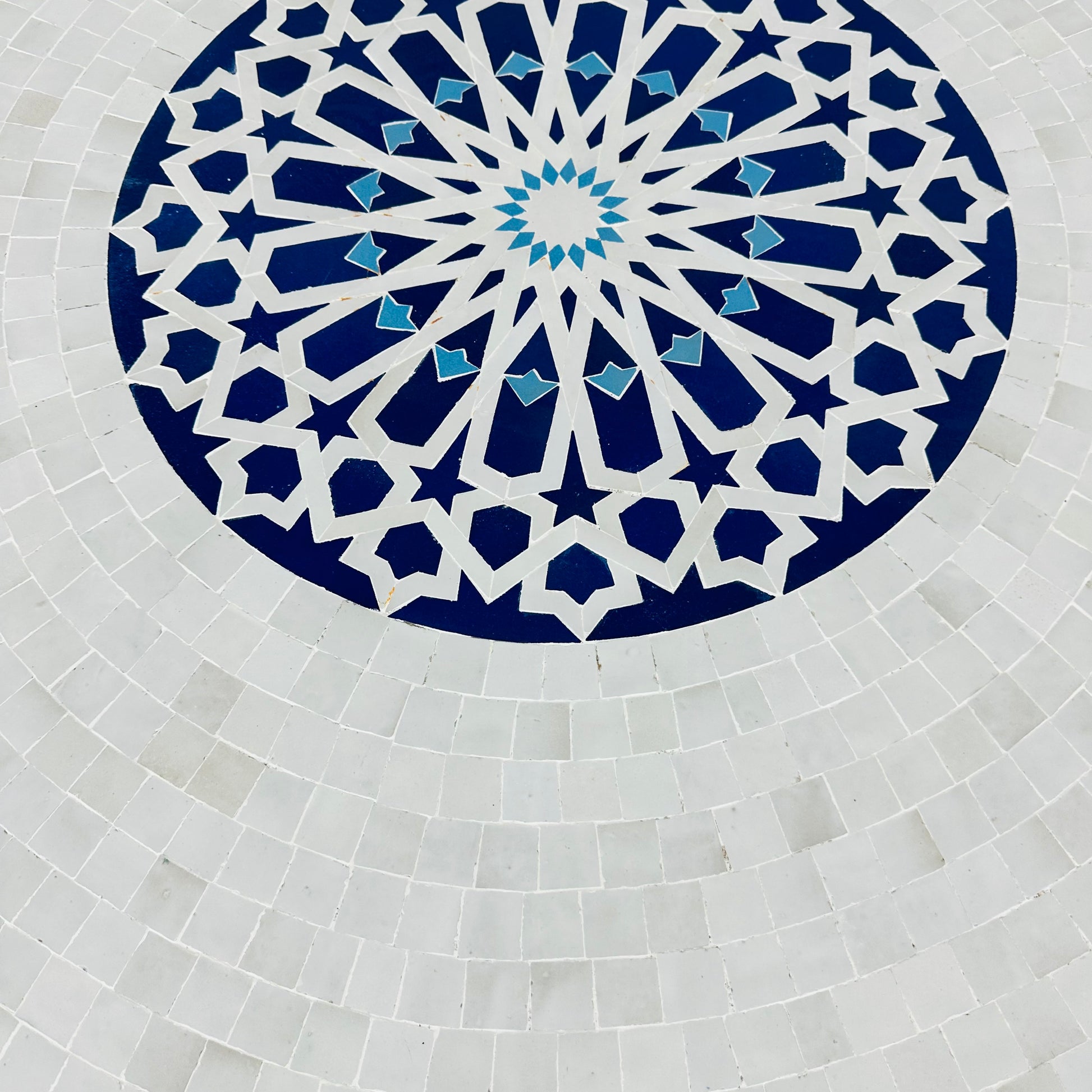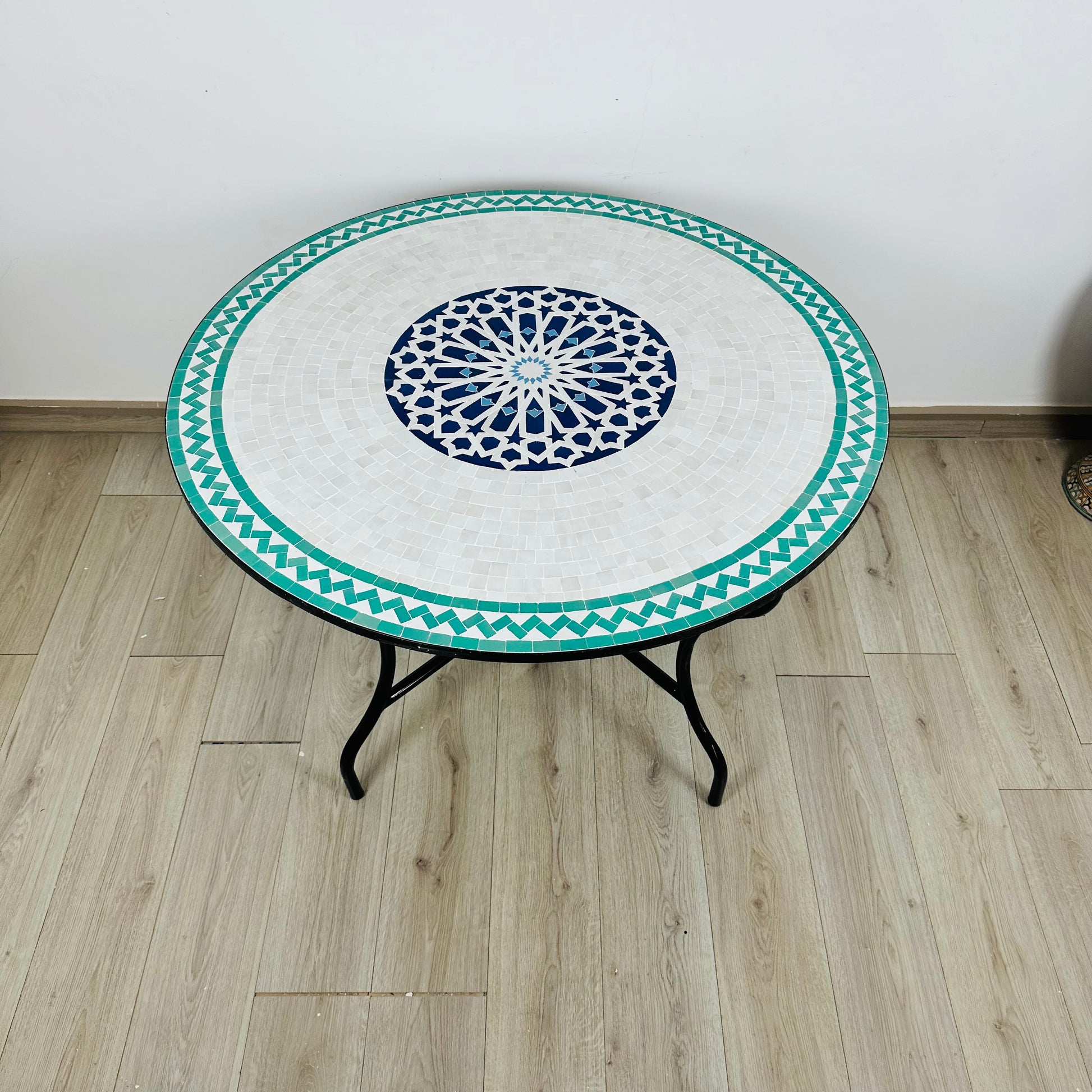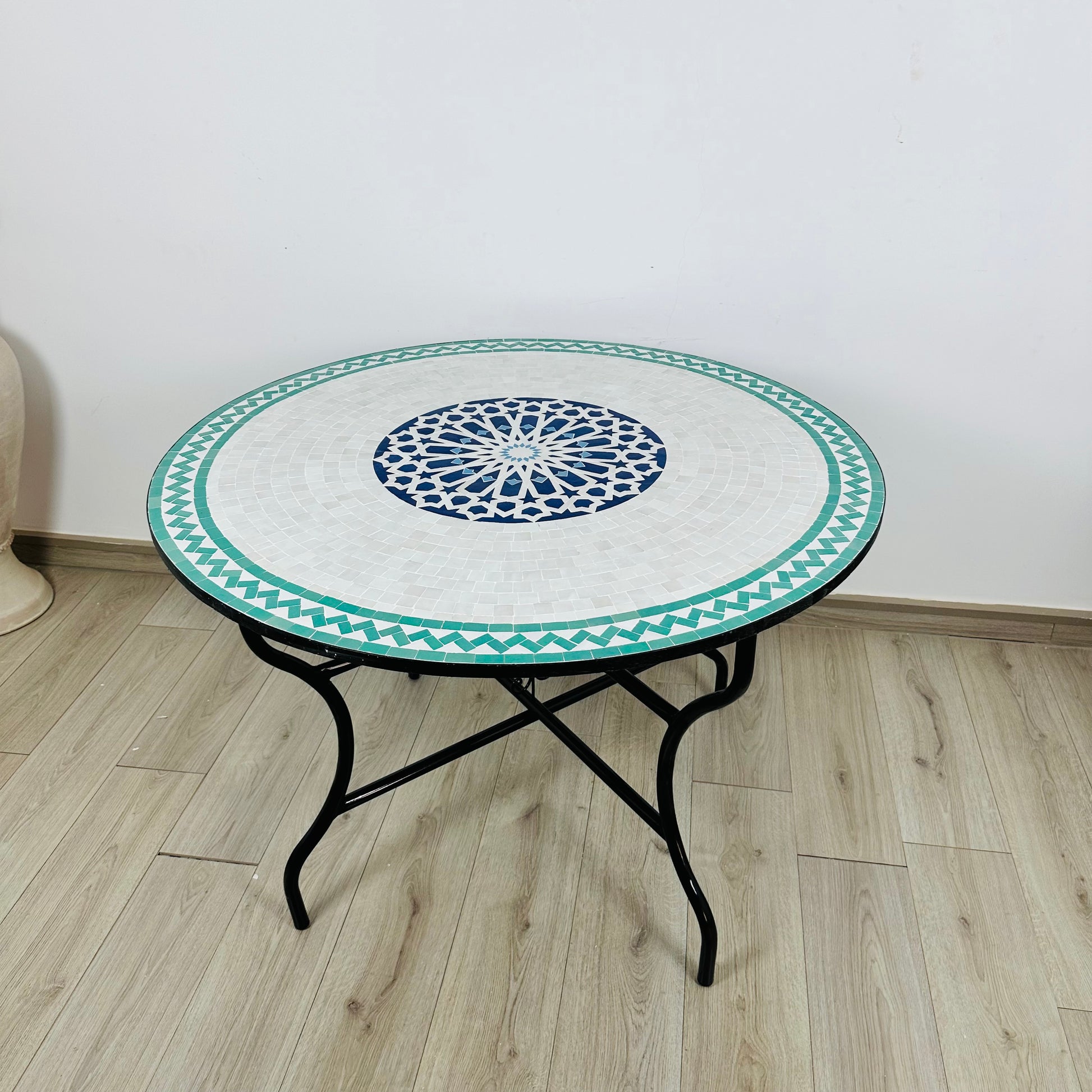 The Serene Elegance Mosaic Table embodies tranquility and sophistication with its minimalist yet striking design. A delicate starburst medallion in deep navy blue sits gracefully at the center, encircled by a pristine white mosaic background and a refreshing turquoise border. This refined contrast creates a balanced and airy aesthetic, making it a perfect addition to both modern and traditional spaces.
