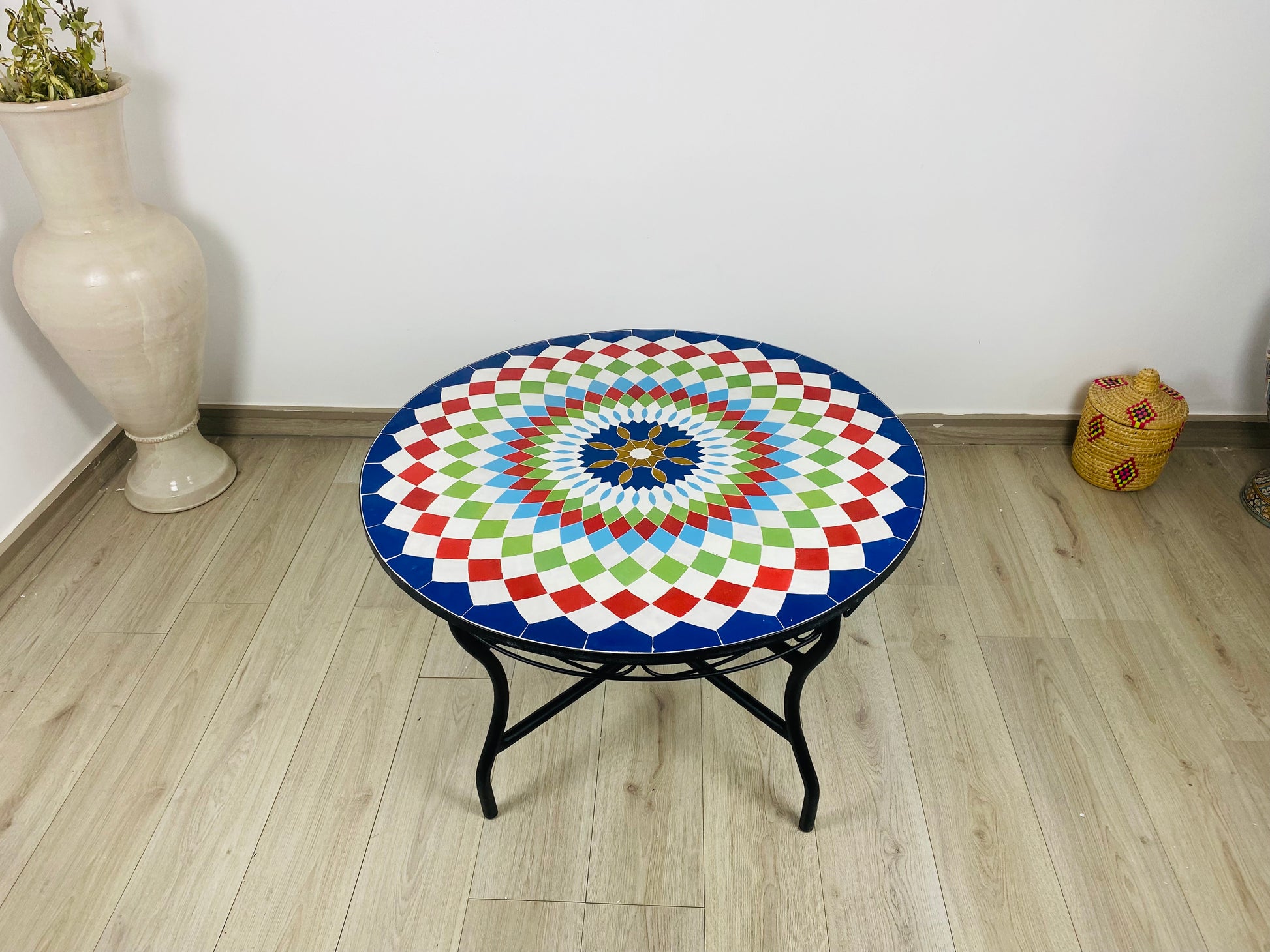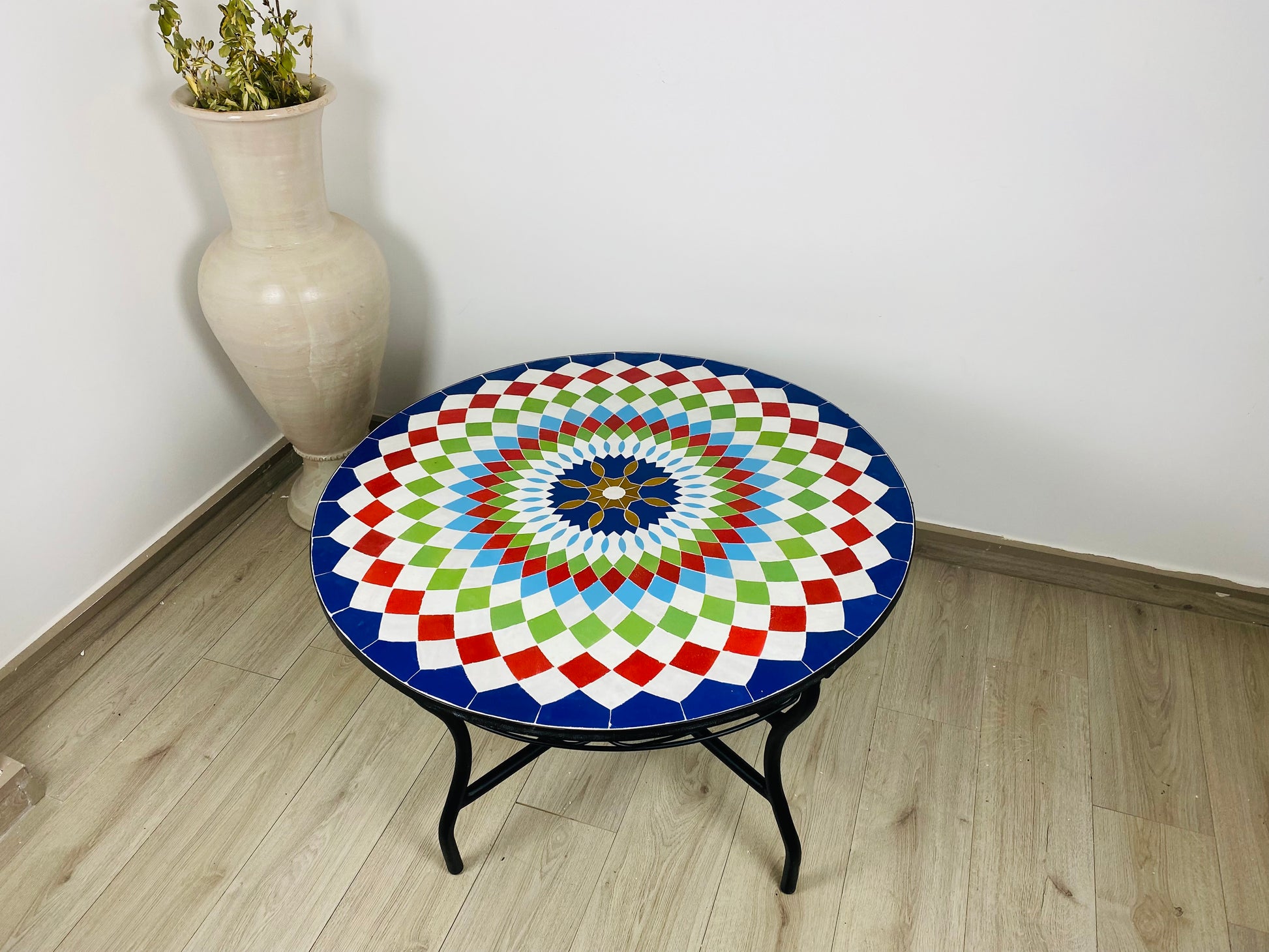 ✔ Materials: Premium mosaic tiles, cement base, sturdy wrought iron frame