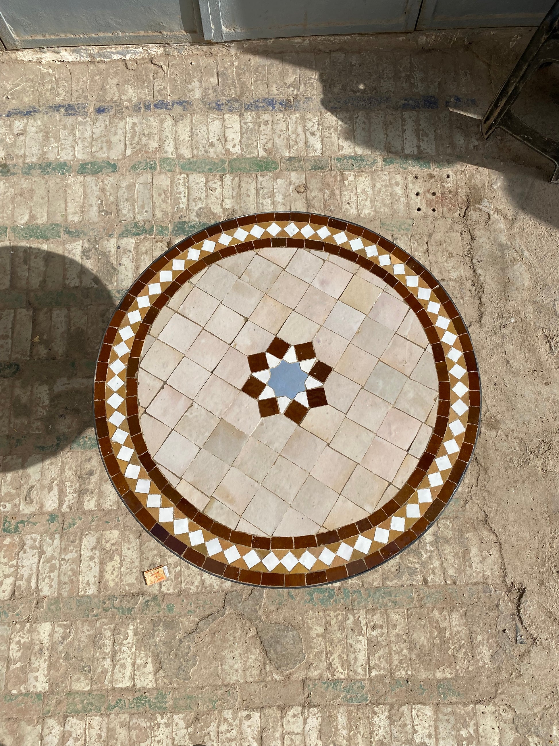 Inspired by the warm, earthy tones of the desert, the Desert Star Mosaic Table is a timeless and elegant addition to any indoor or outdoor space. Featuring a subtle beige tiled surface, this design is centered around a delicate eight-point star motif in soft blue, white, and brown. The rich brown and white geometric border adds depth and contrast, making this handcrafted piece a true work of art.
