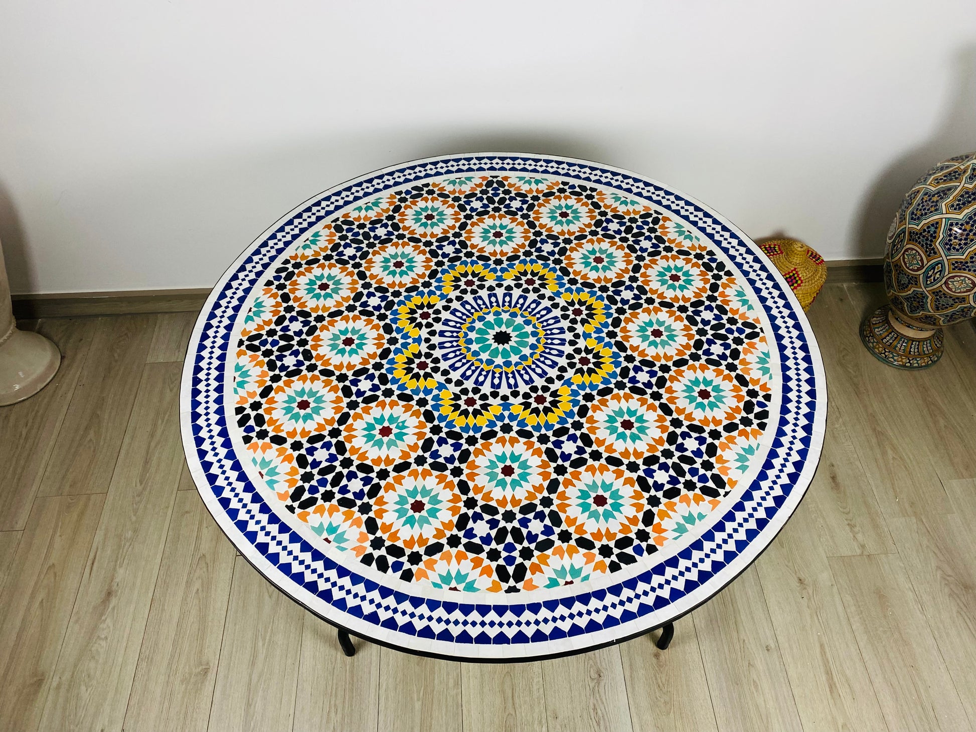 Bring the elegance of Moroccan craftsmanship to your space with this exquisite handcrafted Zellige mosaic table. Designed with a mesmerizing geometric pattern, this round table showcases a harmonious blend of colors, including deep blue, vibrant orange, soft turquoise, warm yellow, and classic white. The intricate starburst motifs radiate from the center, creating a visually captivating design.