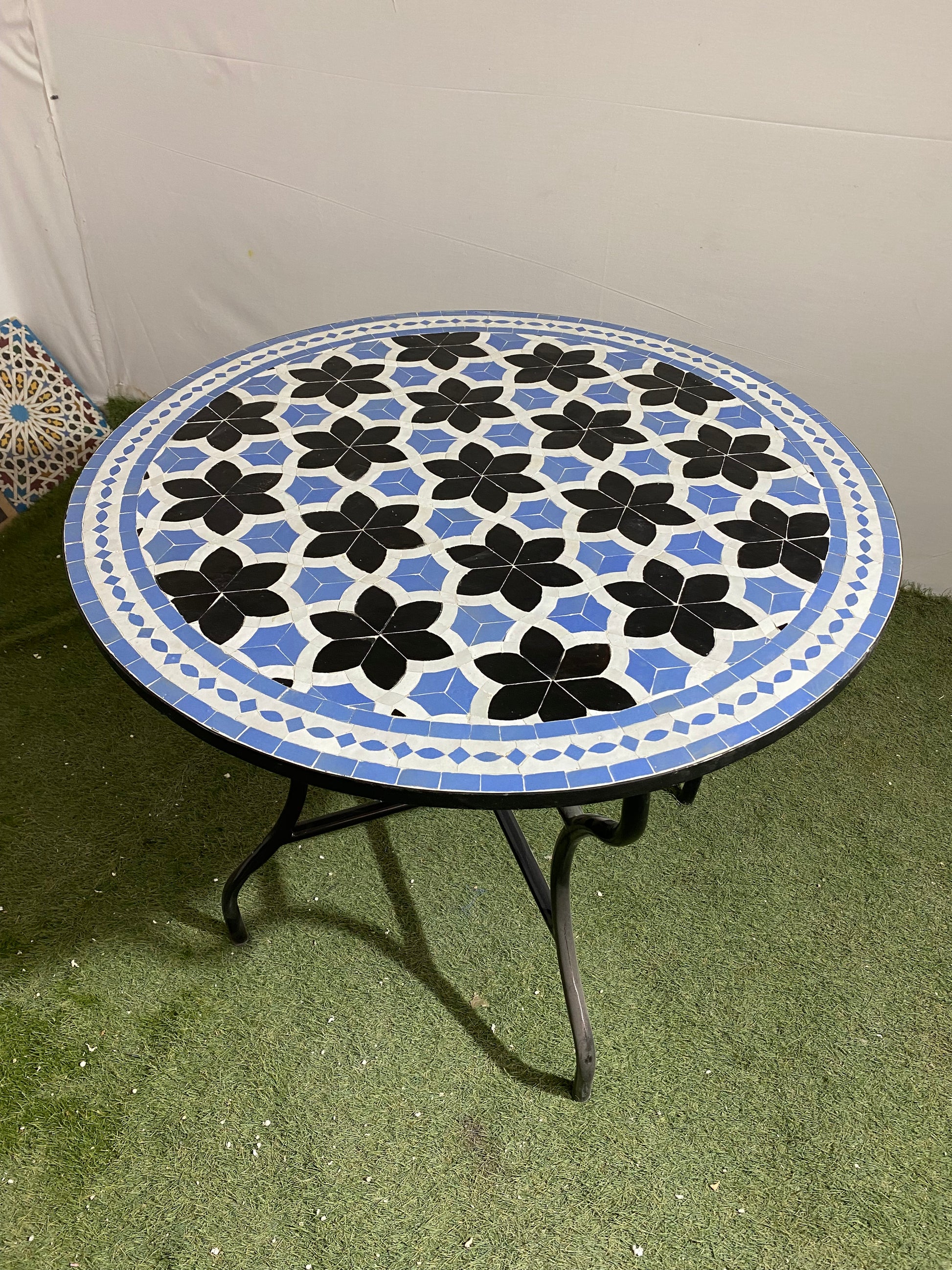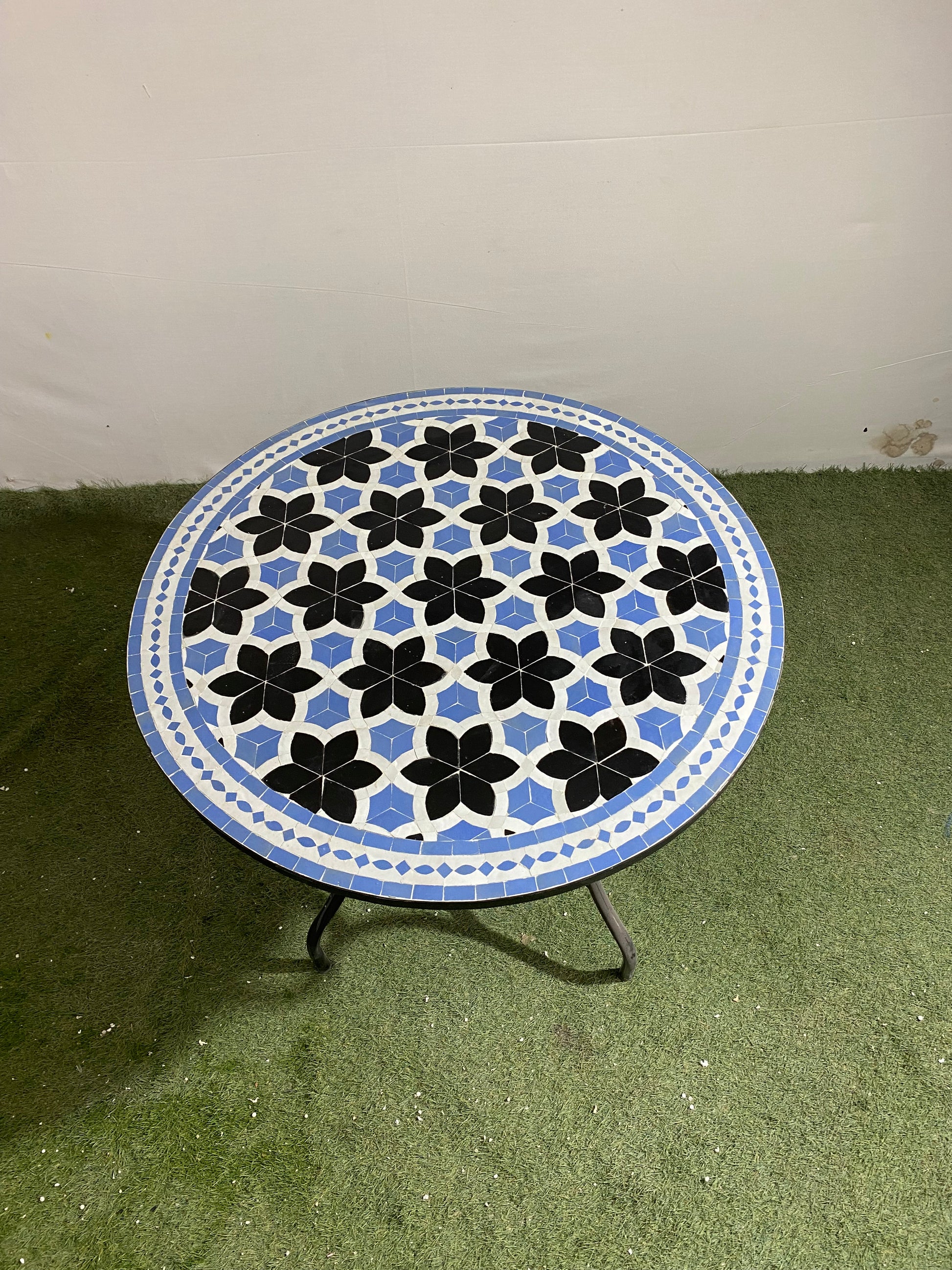 This handcrafted Moroccan Zellige mosaic table features an elegant black and blue floral pattern, delicately arranged to create a timeless geometric design. The contrast of bold black tiles against soft blue and white accents brings a sophisticated balance, while the intricate blue border adds an extra touch of elegance. This piece is a refined blend of tradition and modernity, making it an ideal statement for any space.
