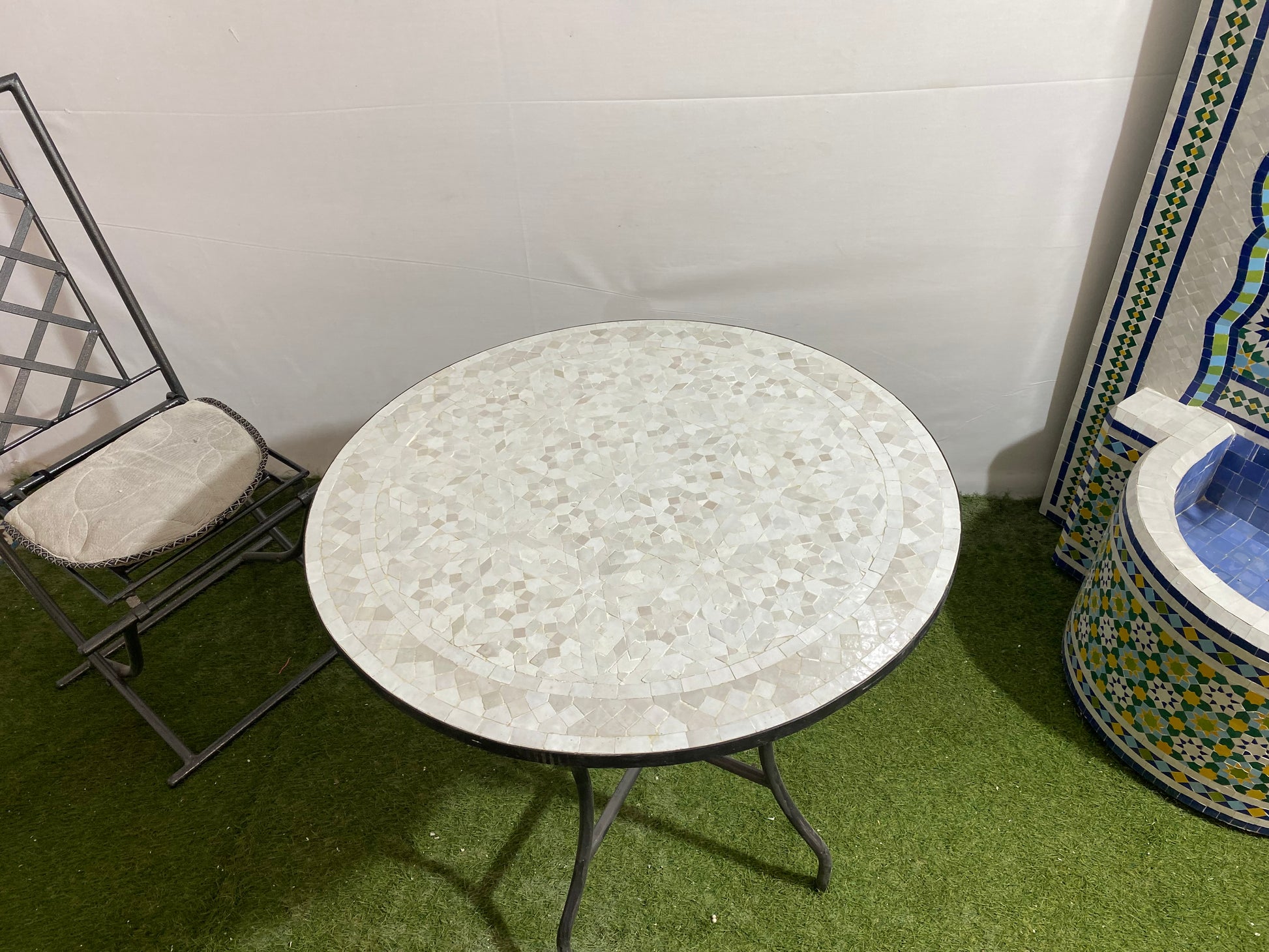 - TABLES : Mosaic, tiles, Clay, Iron, legs cap, metal base.