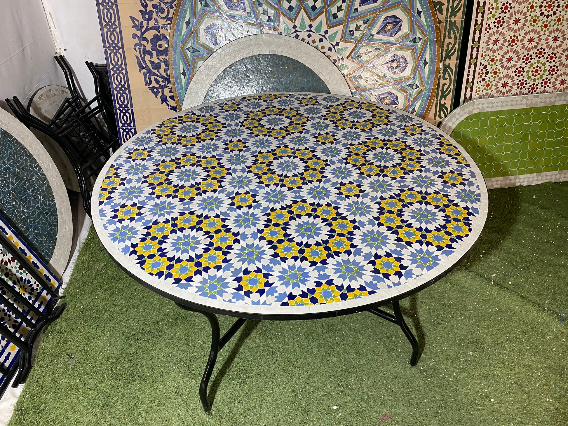 This handcrafted Moroccan Zellige mosaic table features an intricate repeating floral pattern, meticulously crafted with a stunning mix of deep blue, bright yellow, soft white, and pastel green. The mesmerizing geometric symmetry reflects centuries of Moroccan artistry, while the subtle beige border adds a refined touch, making it a timeless piece that enhances any space.