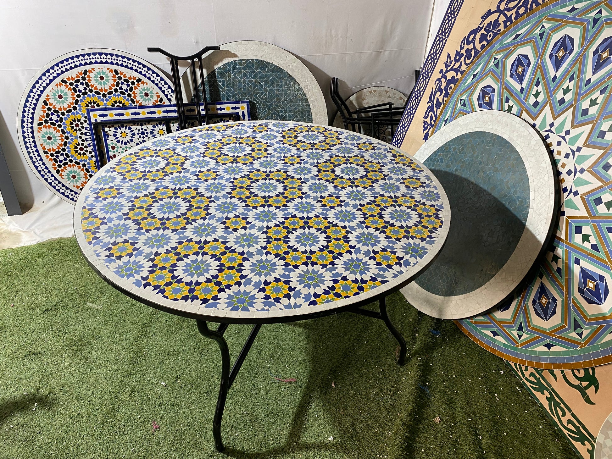 - TABLES : Mosaic, tiles, Clay, Iron, legs cap, metal base.