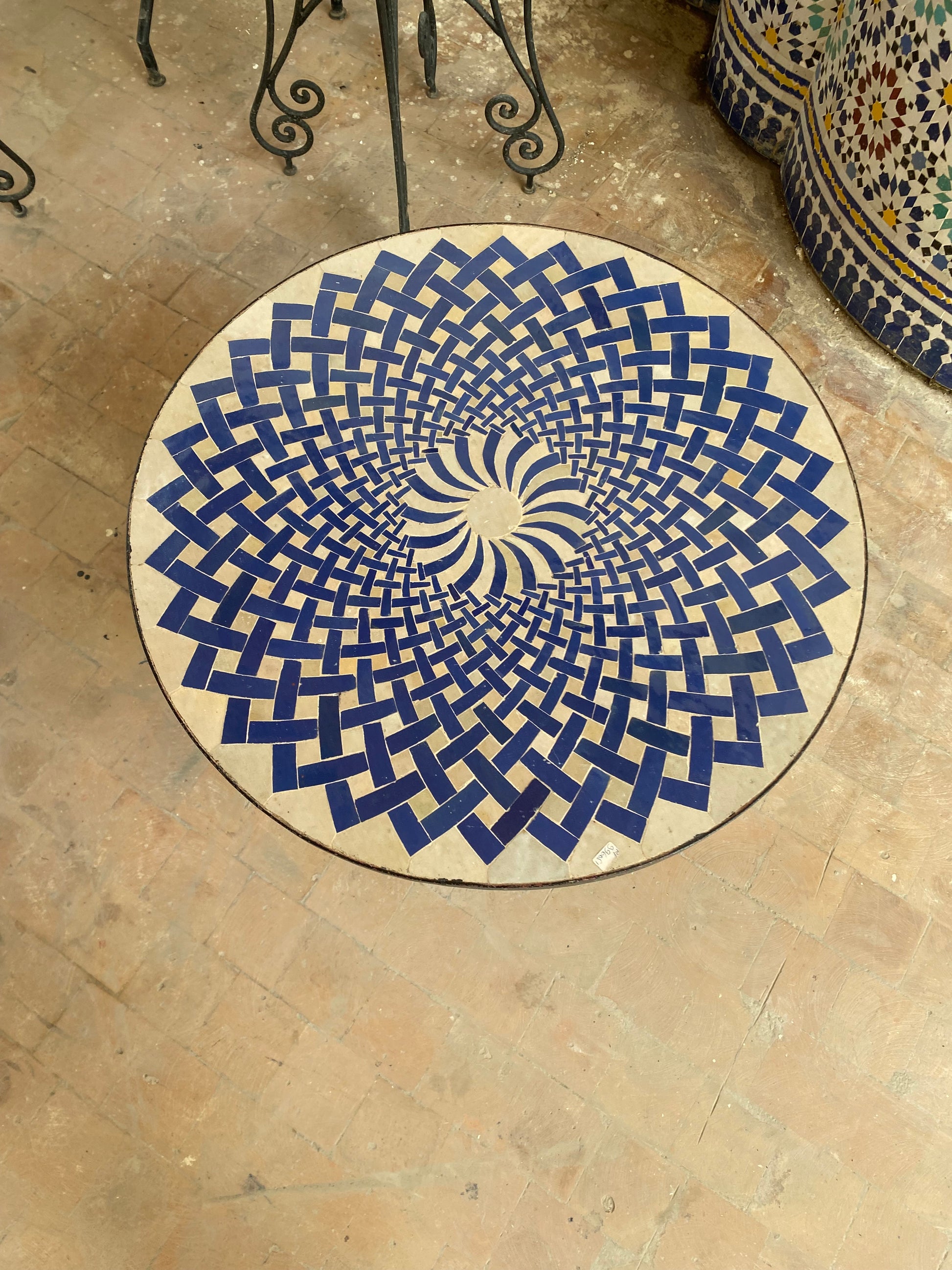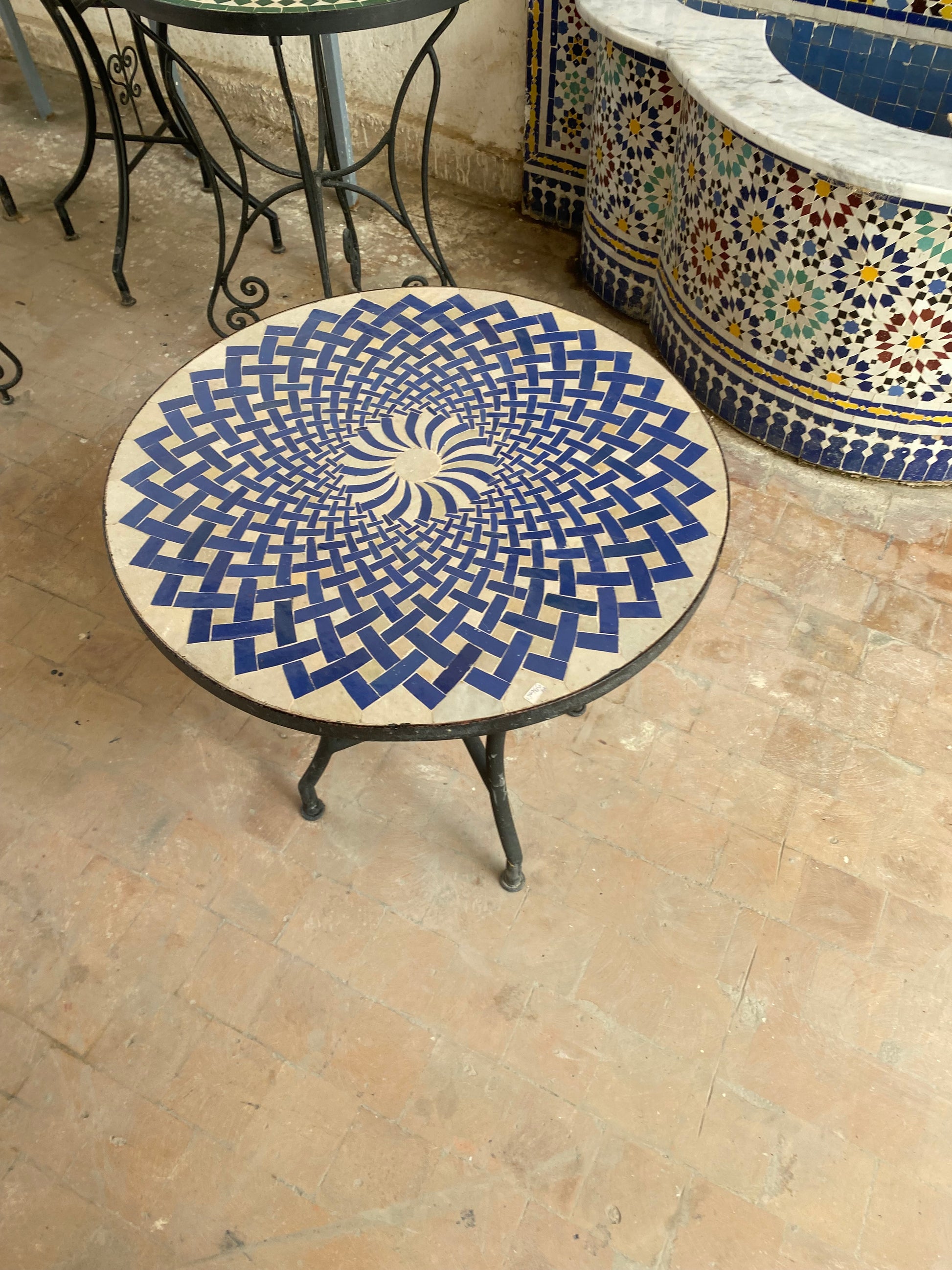 This exquisite Moroccan mosaic table showcases a unique spiral pattern in deep blue and white, creating a mesmerizing optical illusion. The meticulously arranged Zellige tiles reflect the artistry of Moroccan craftsmanship, making this table a standout piece for any space.