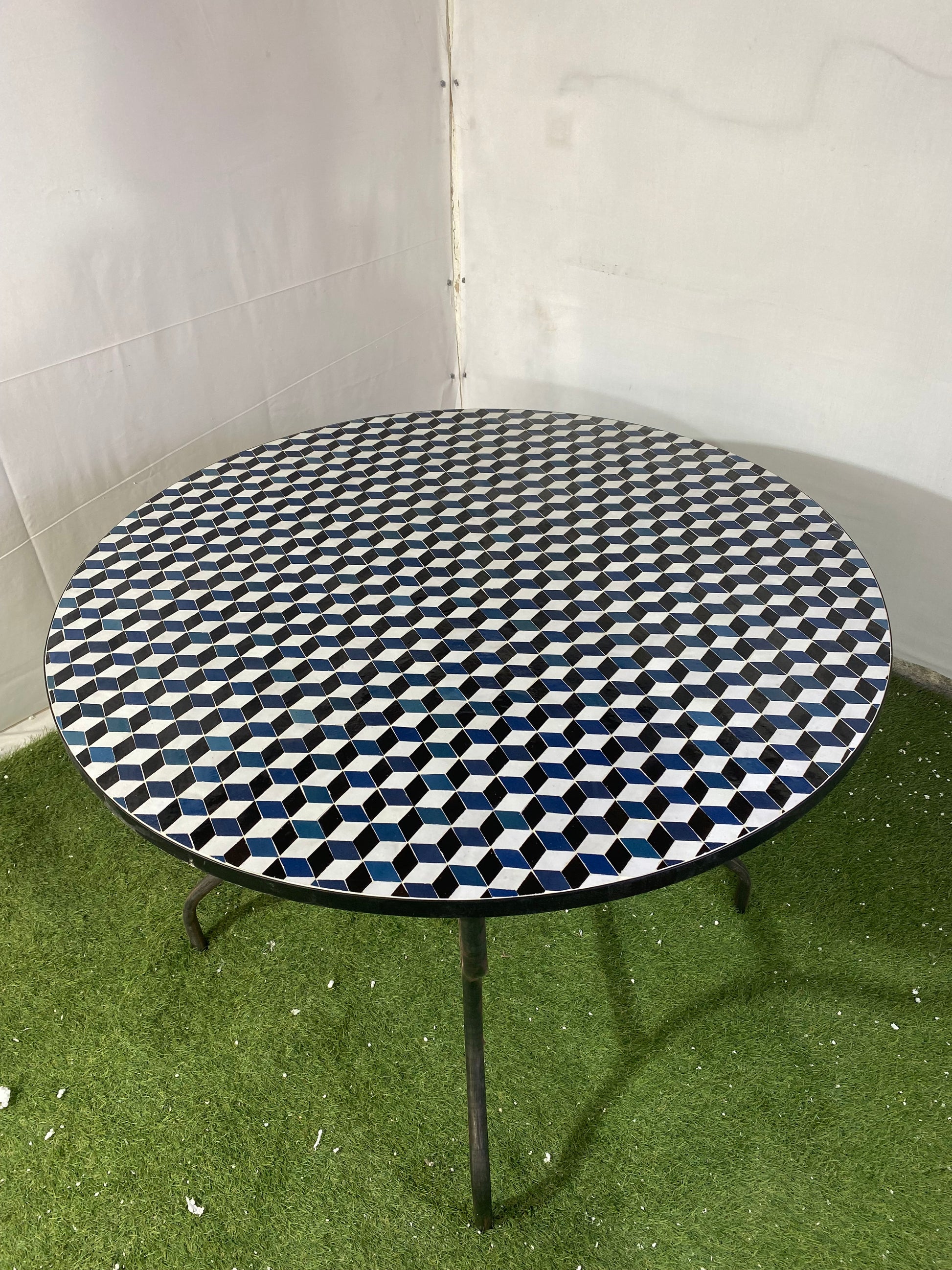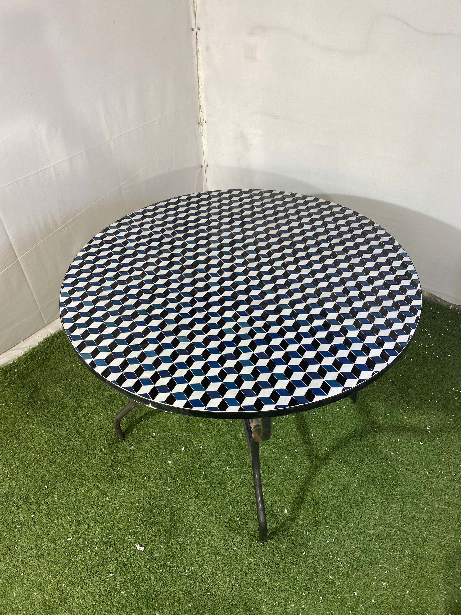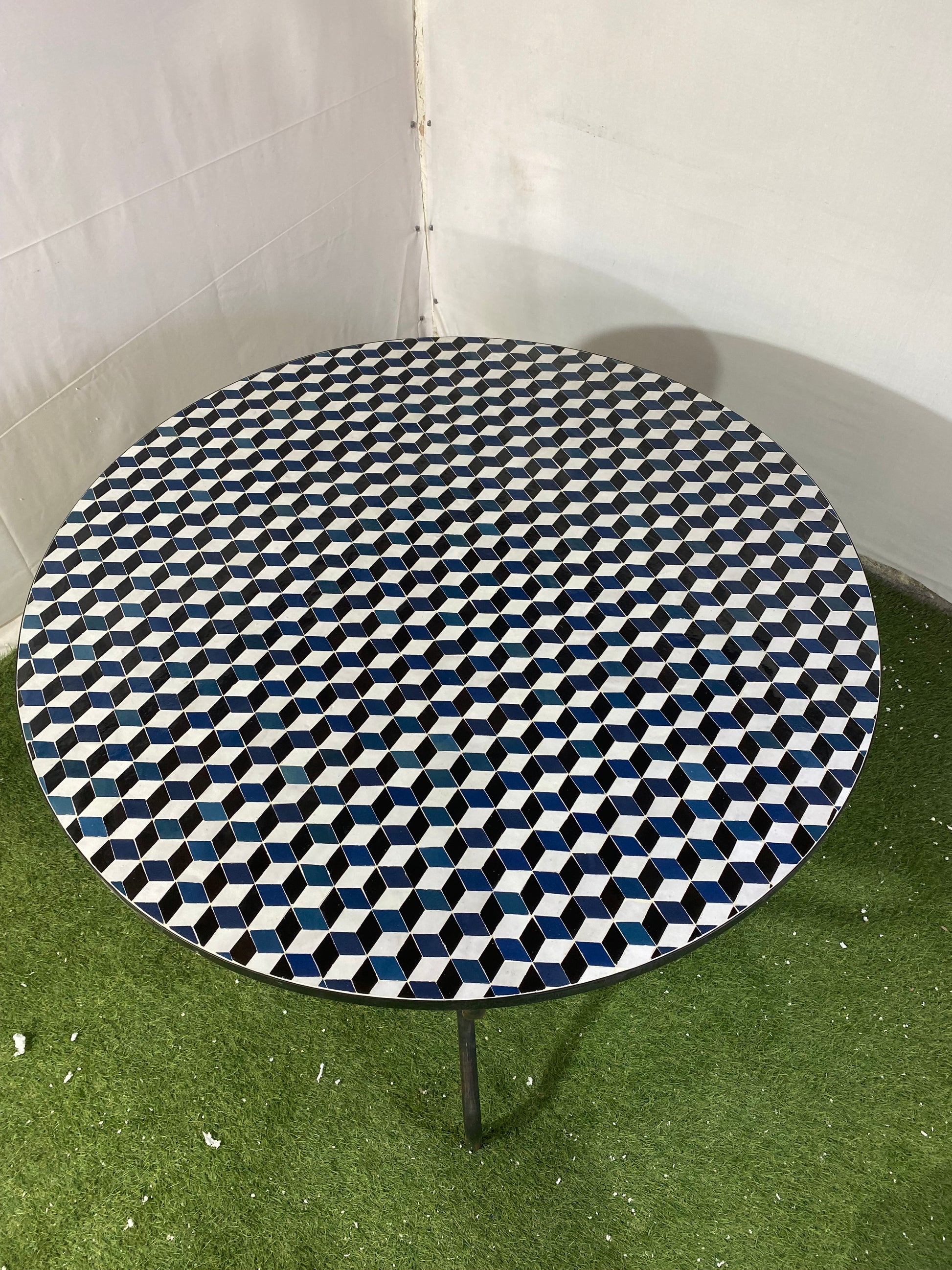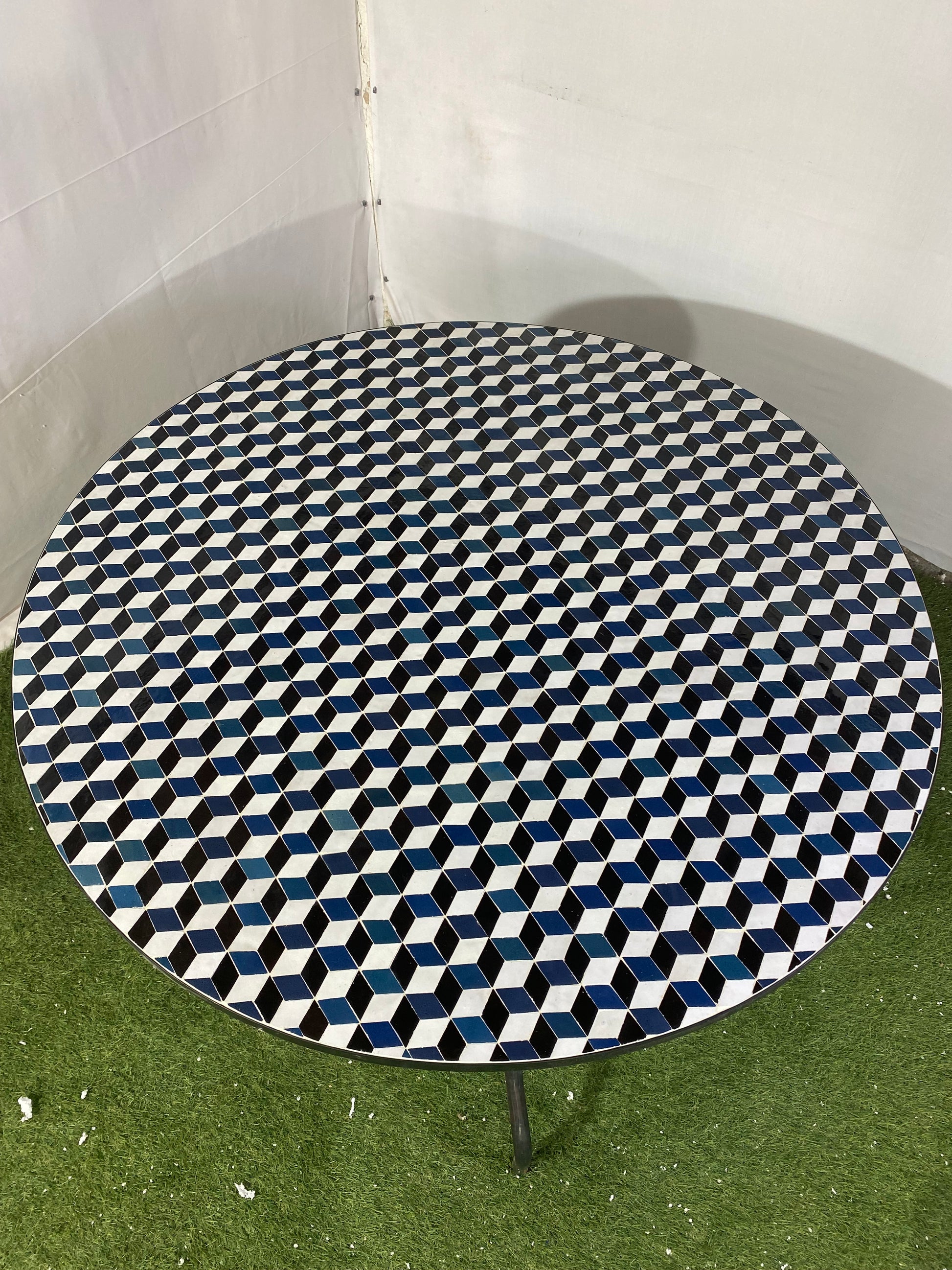 This handcrafted Moroccan Zellige mosaic table features a mesmerizing 3D cube pattern in shades of black, white, and deep blue. The geometric illusion creates a bold and dynamic visual effect, making this table an eye-catching statement piece. Its monochromatic palette ensures versatility, complementing both modern and traditional interiors.