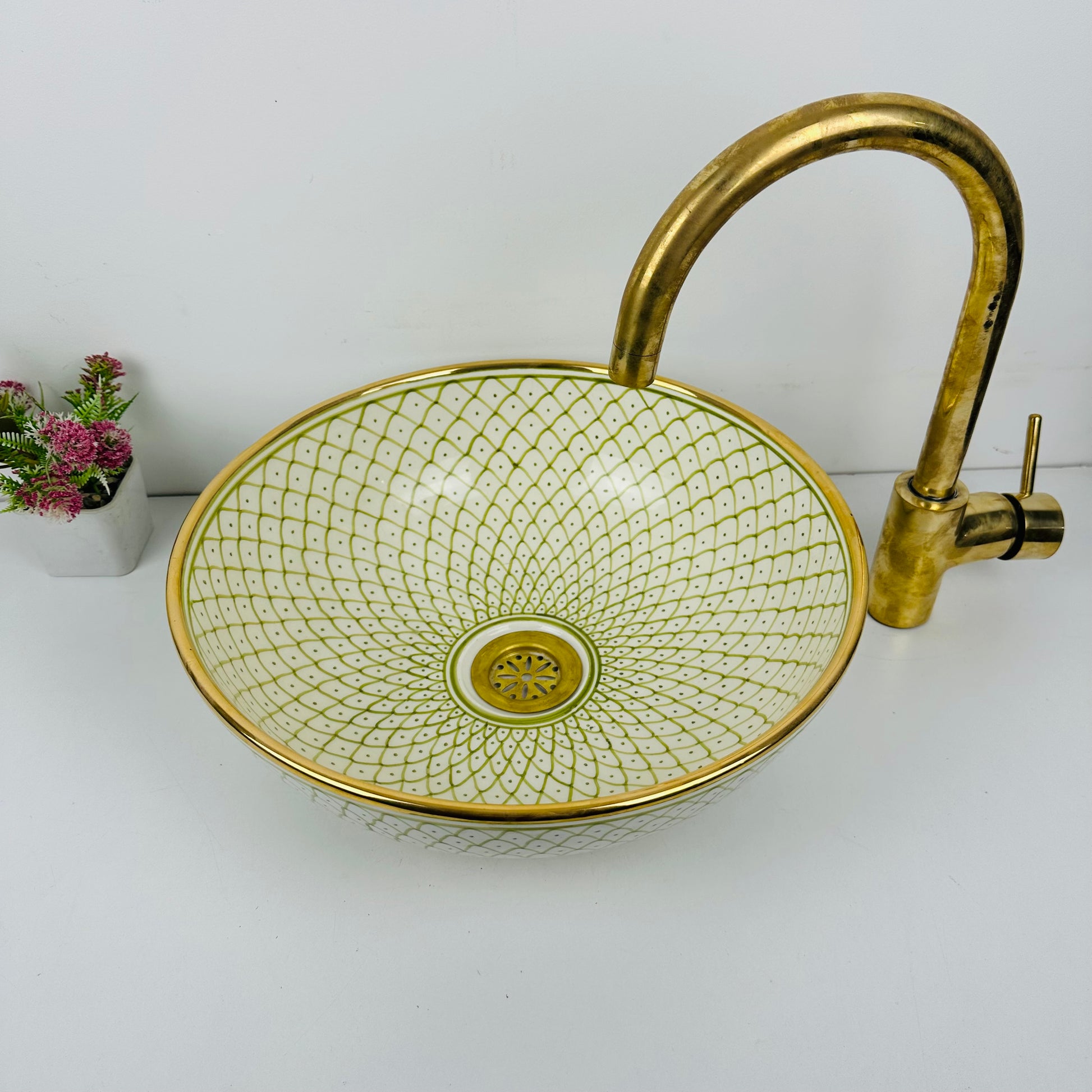 14k Gold Emerald Xscape: Handcrafted Ceramic Sink with X-Shaped Designs in Light Green