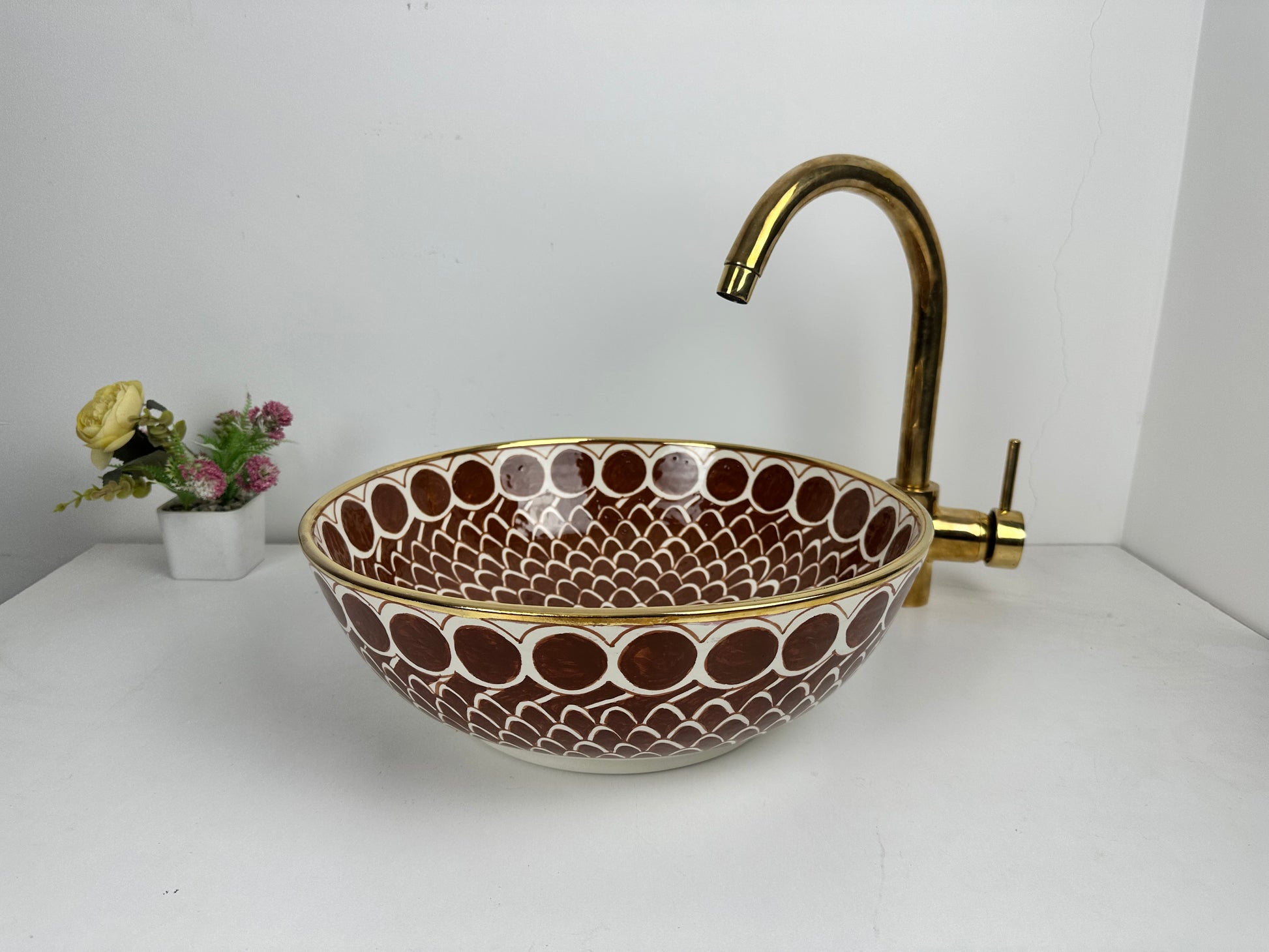 Add warmth and sophistication to your bathroom with this Rustic Brown Scalloped Vessel Sink, featuring hand-painted circular and scalloped designs in rich brown tones. The intricate pattern, complemented by a gold-accented rim, blends artisanal charm with modern elegance. Made from high-quality ceramic and coated with a smooth, water-resistant glaze, it offers both beauty and durability, perfect for enhancing any rustic or traditional space.