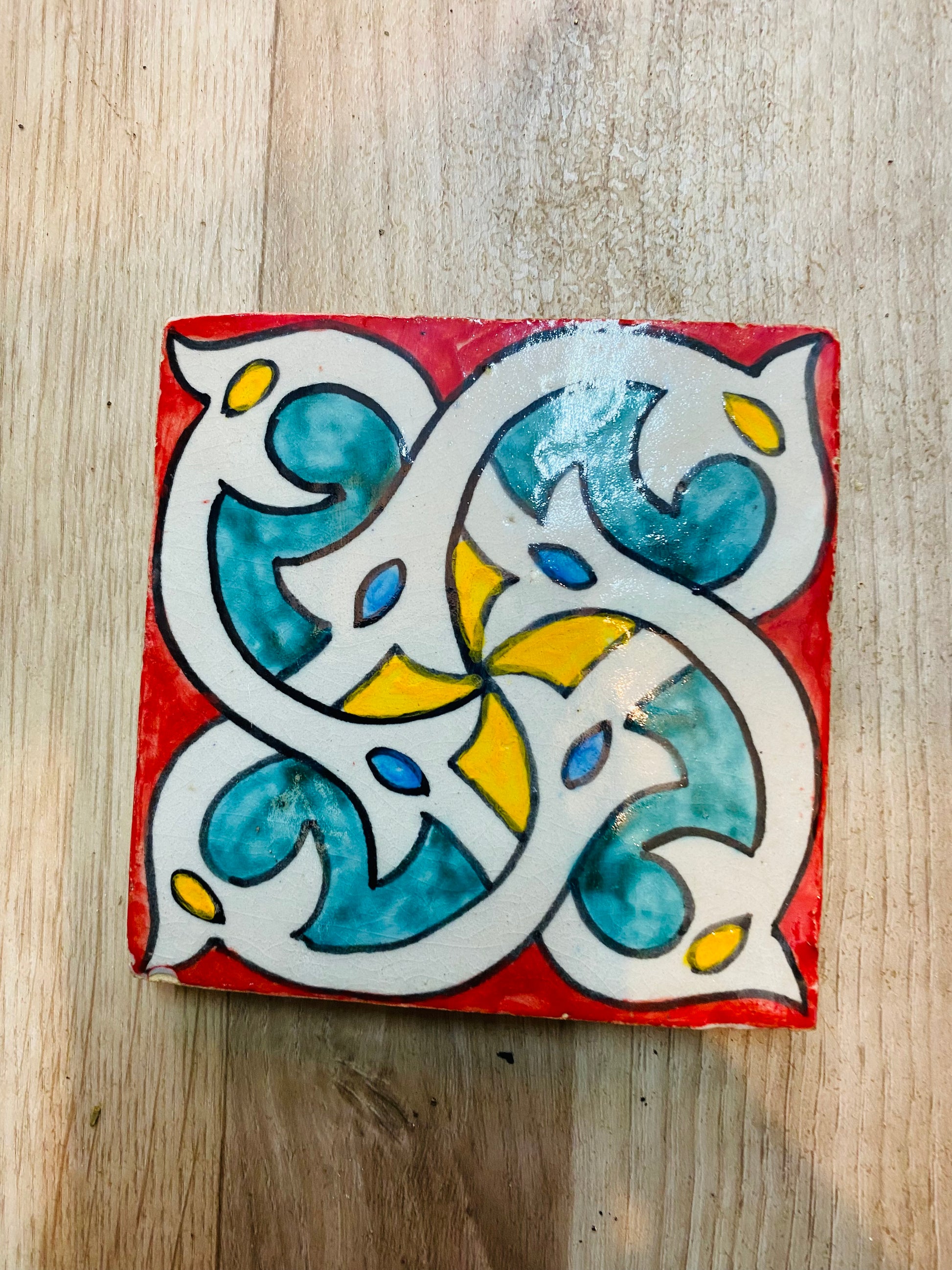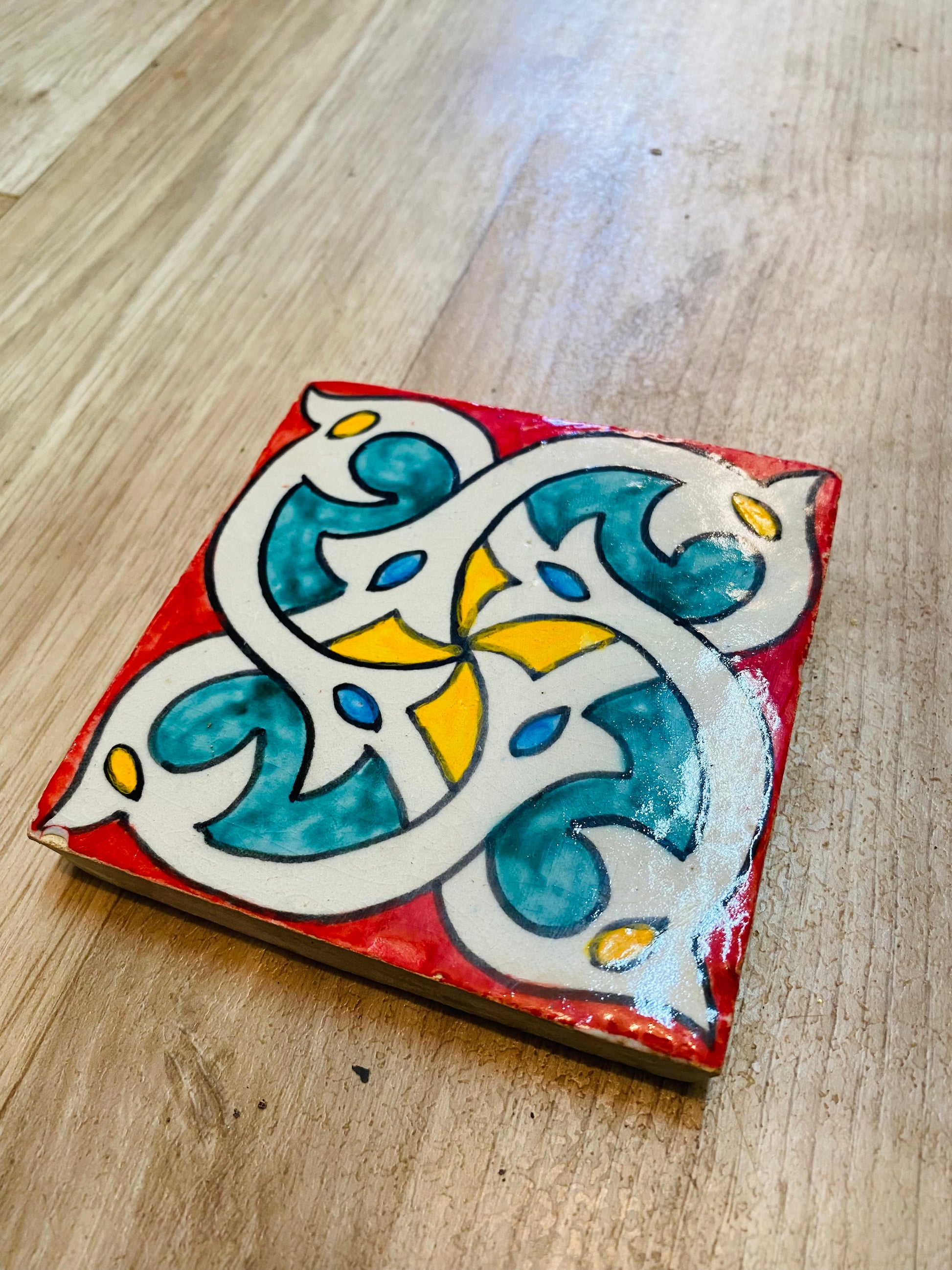 The Arabesque Flame Moroccan Zellige Tile is a bold expression of Moroccan artistry, featuring a vibrant intertwining floral motif on a striking red background. The intricate white arabesque patterns, accentuated by turquoise and golden yellow details, create a mesmerizing contrast, bringing warmth and sophistication to any space. The design embodies the fluidity of traditional Moroccan craftsmanship, making it a perfect statement piece.