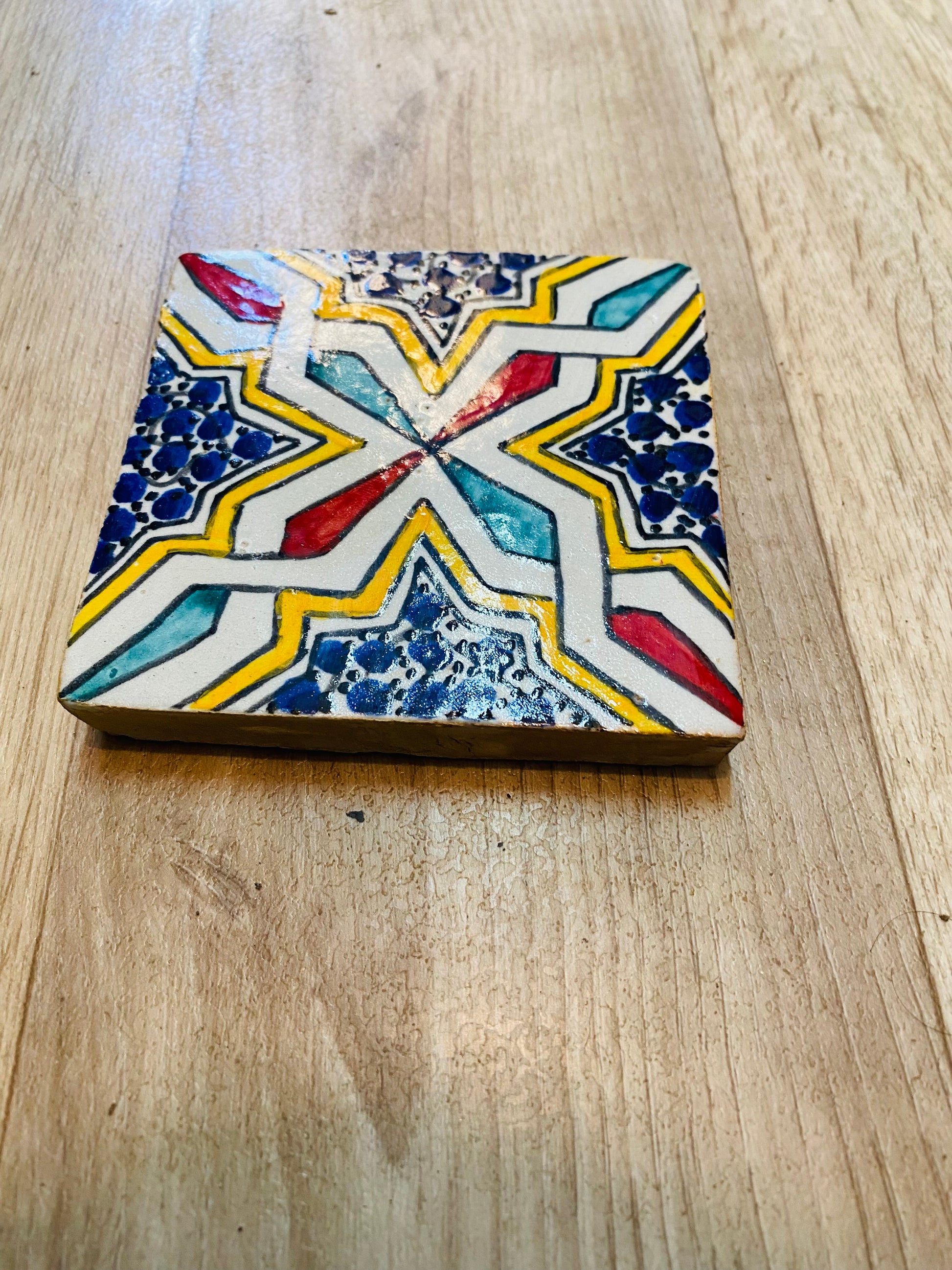 The Royal Starburst Moroccan Zellige Tile is a mesmerizing blend of geometric precision and traditional craftsmanship. Featuring a radiant starburst pattern with striking red, turquoise, and golden yellow accents, this tile brings an air of regal elegance to any space. The deep blue dotted texture in the background enhances the intricate details, making it a perfect representation of authentic Moroccan artistry. Each tile is handmade and hand-painted, ensuring uniqueness and character in every piece.