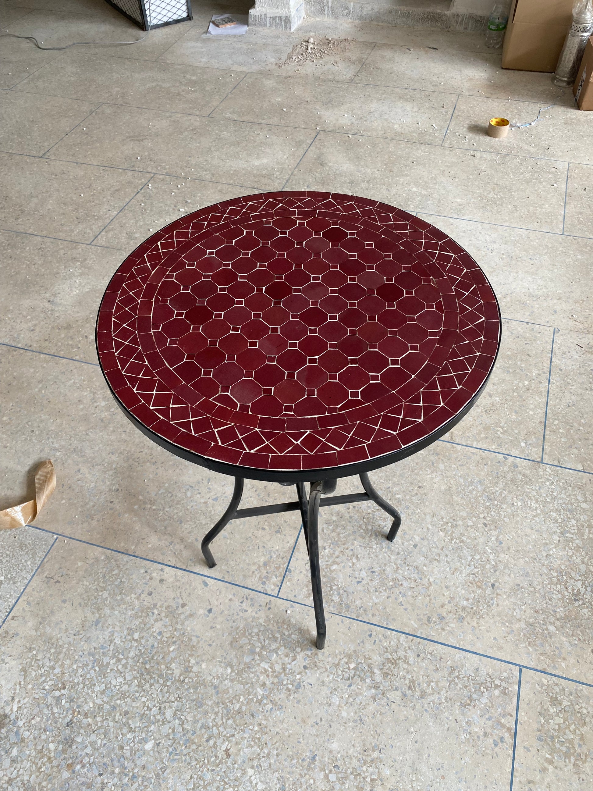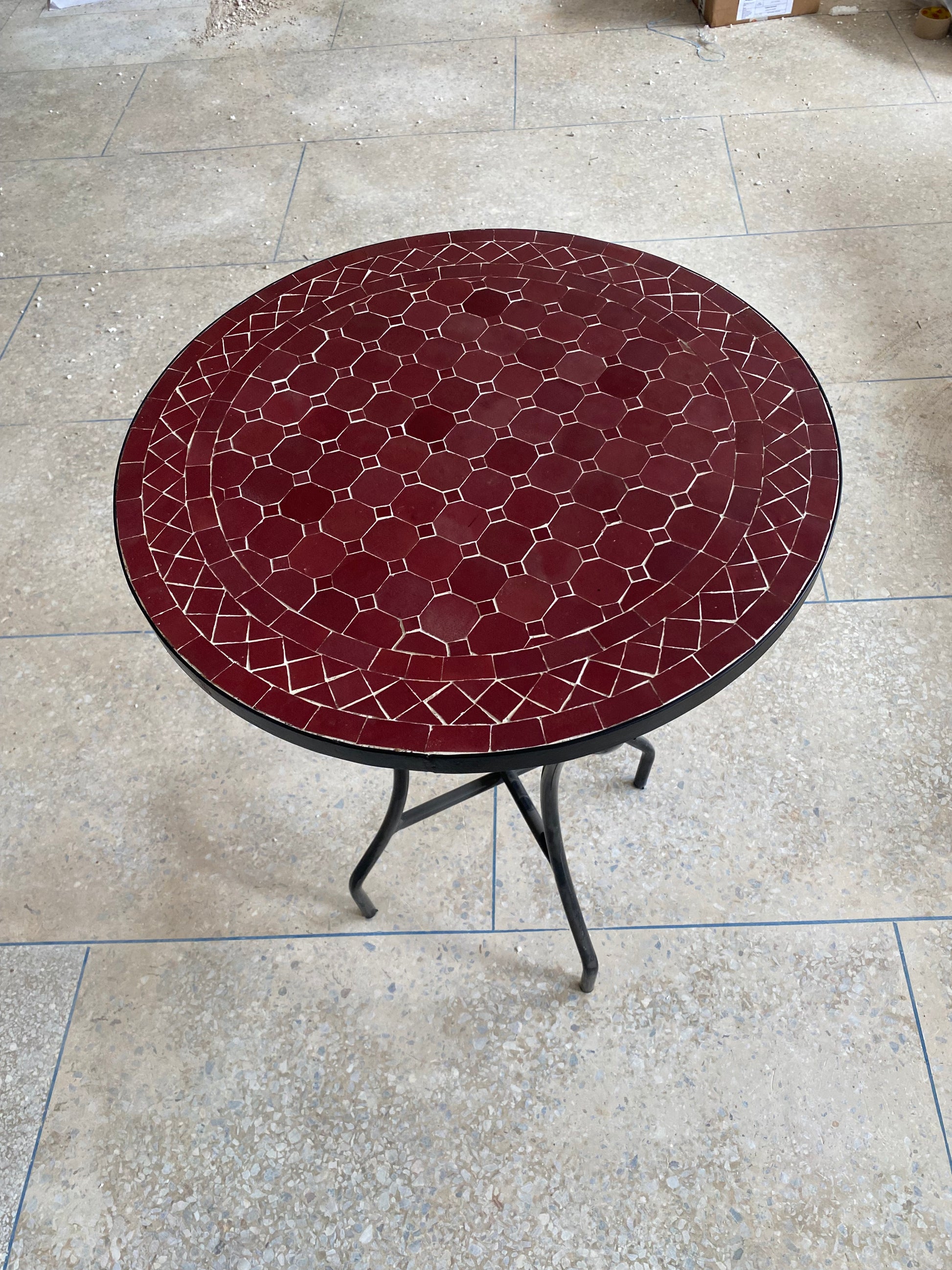 Make a bold statement with this exquisite handcrafted mosaic table, featuring a deep crimson red tile design that exudes warmth and sophistication. The rich, glossy surface is adorned with a delicate hexagonal pattern and an intricately detailed border, adding depth and elegance to its aesthetic. Resting on a sturdy wrought iron base, this table seamlessly blends durability with artistic beauty, making it a perfect addition to both indoor and outdoor spaces.