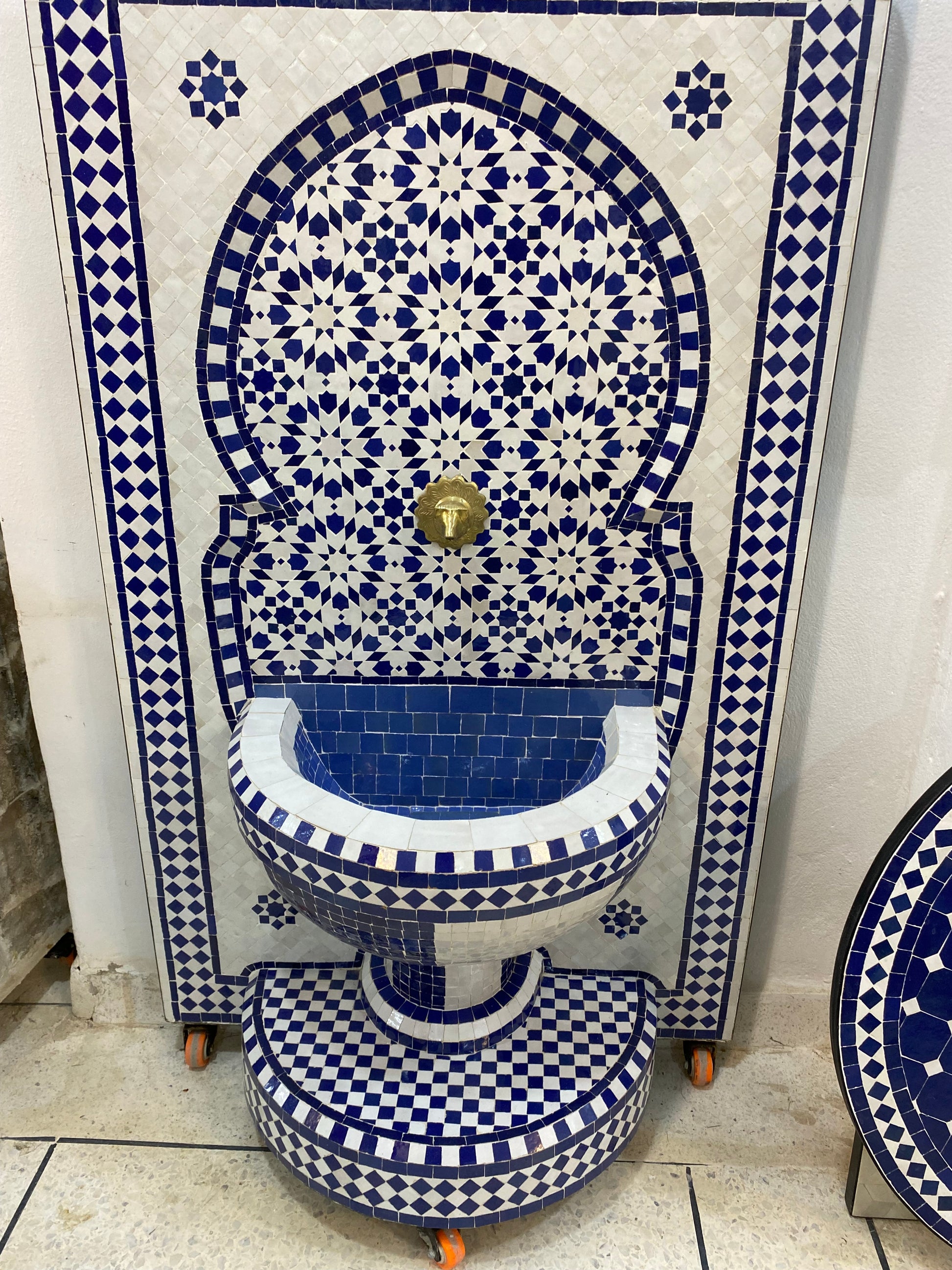 This exquisite Moroccan Zellige fountain embodies the beauty of traditional craftsmanship, blending geometric precision, Moorish design, and refined elegance. Its blue and white mosaic tiles, hand-cut and meticulously arranged, create a mesmerizing effect, while the brass lion-head spout adds a regal touch.