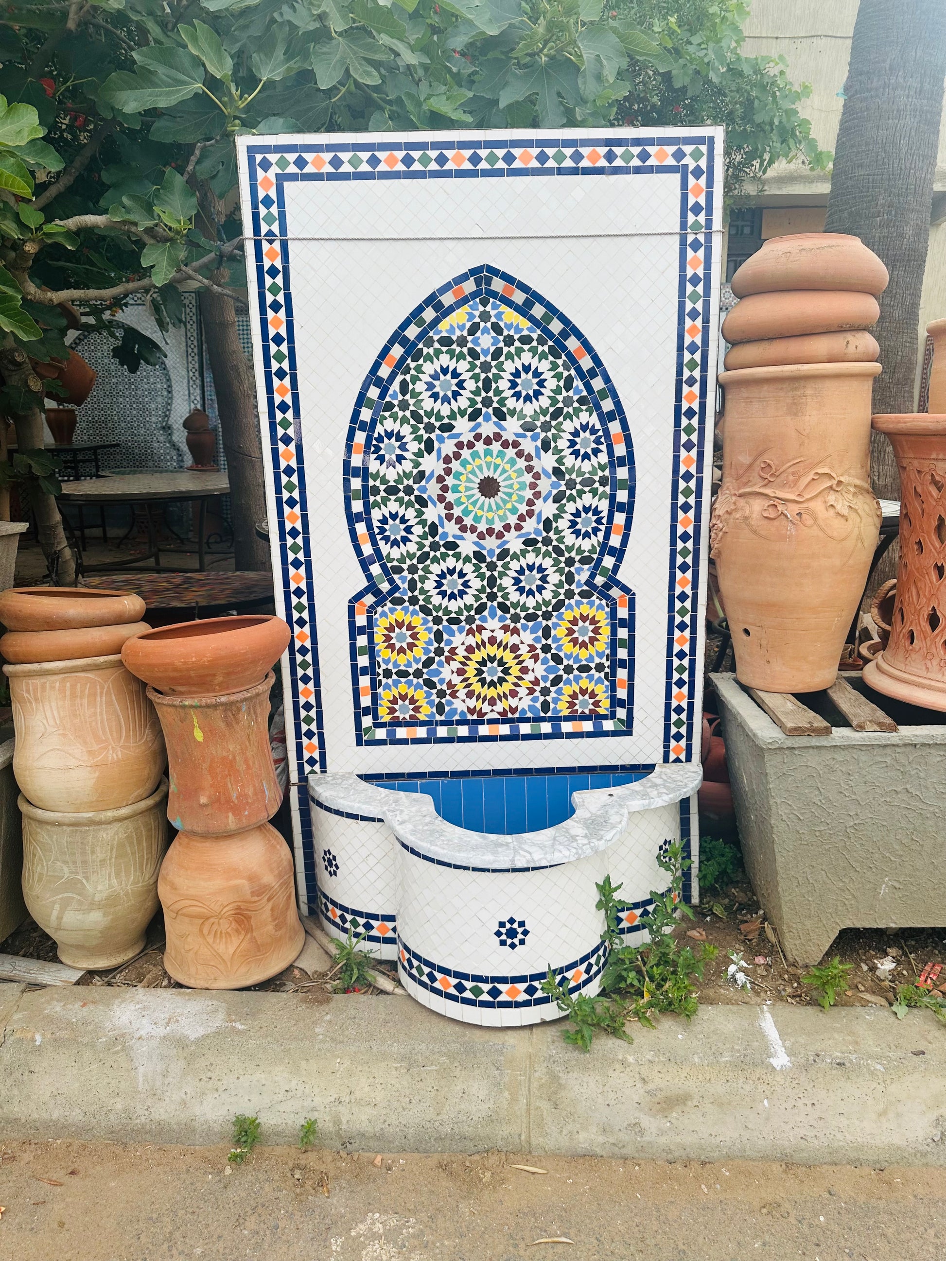This stunning handcrafted Moroccan fountain is a perfect blend of tradition and sophistication, featuring intricate white Zellige tiles with delicate floral patterns. Designed with a semi-circular marble-detailed basin, it brings an aura of elegance and serenity to any space.