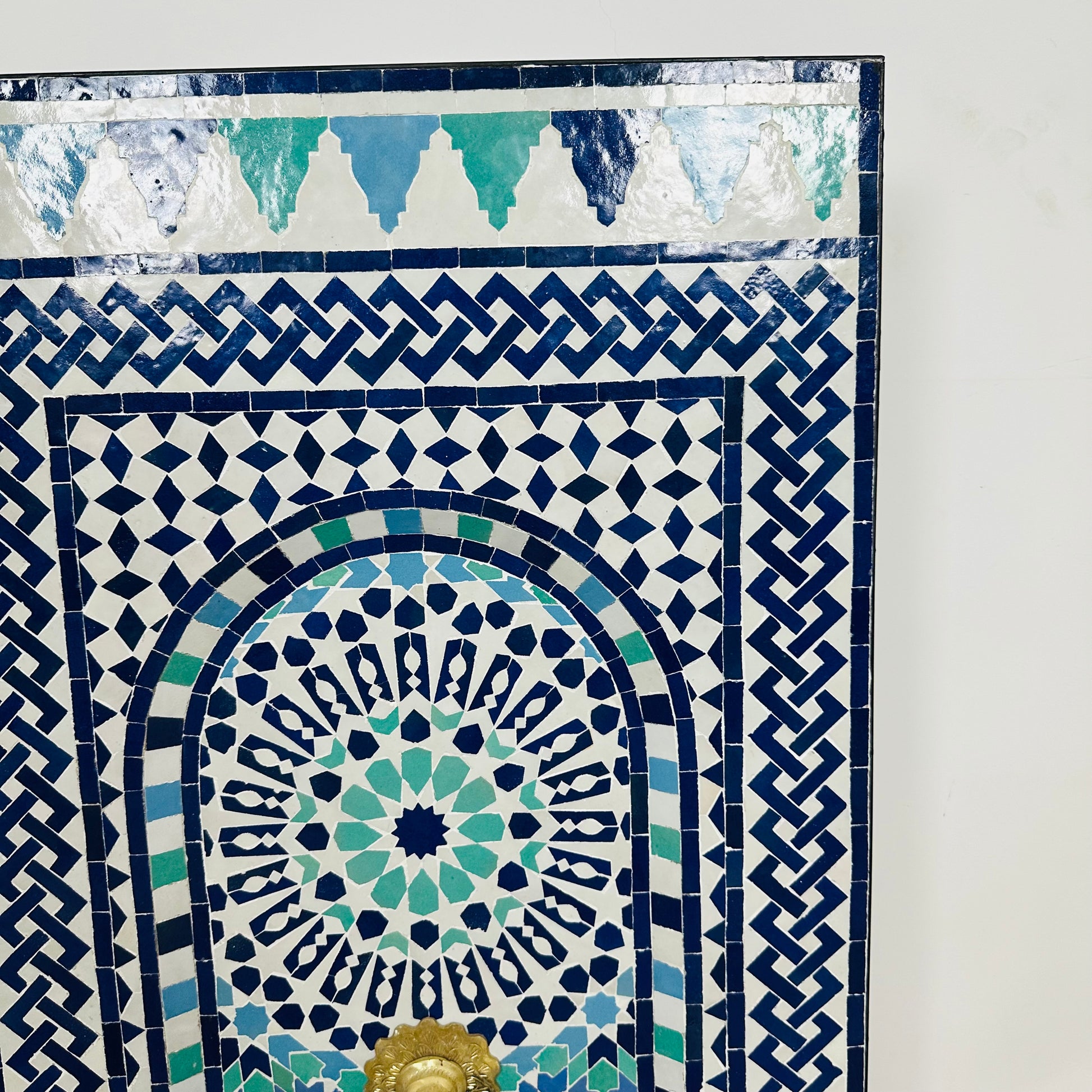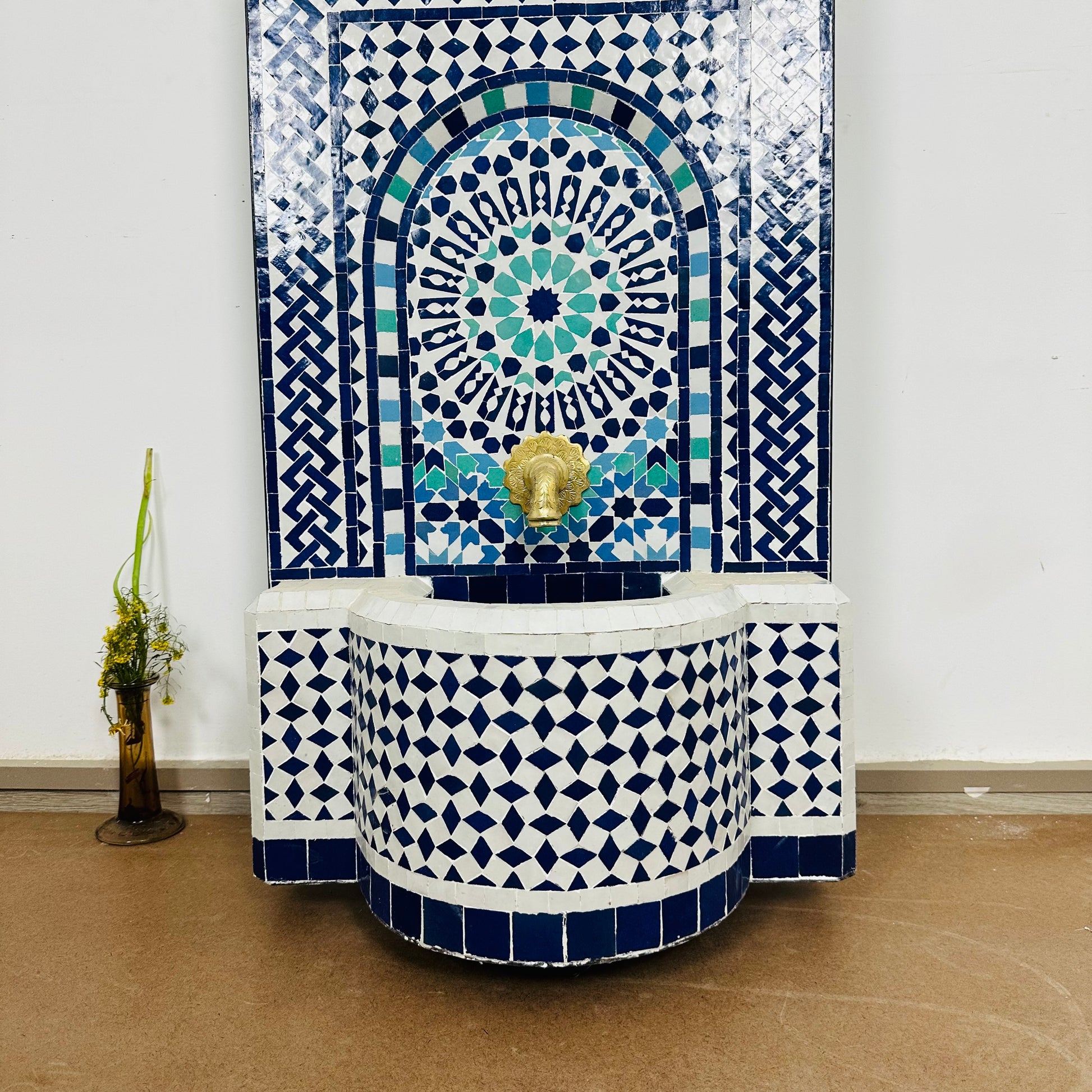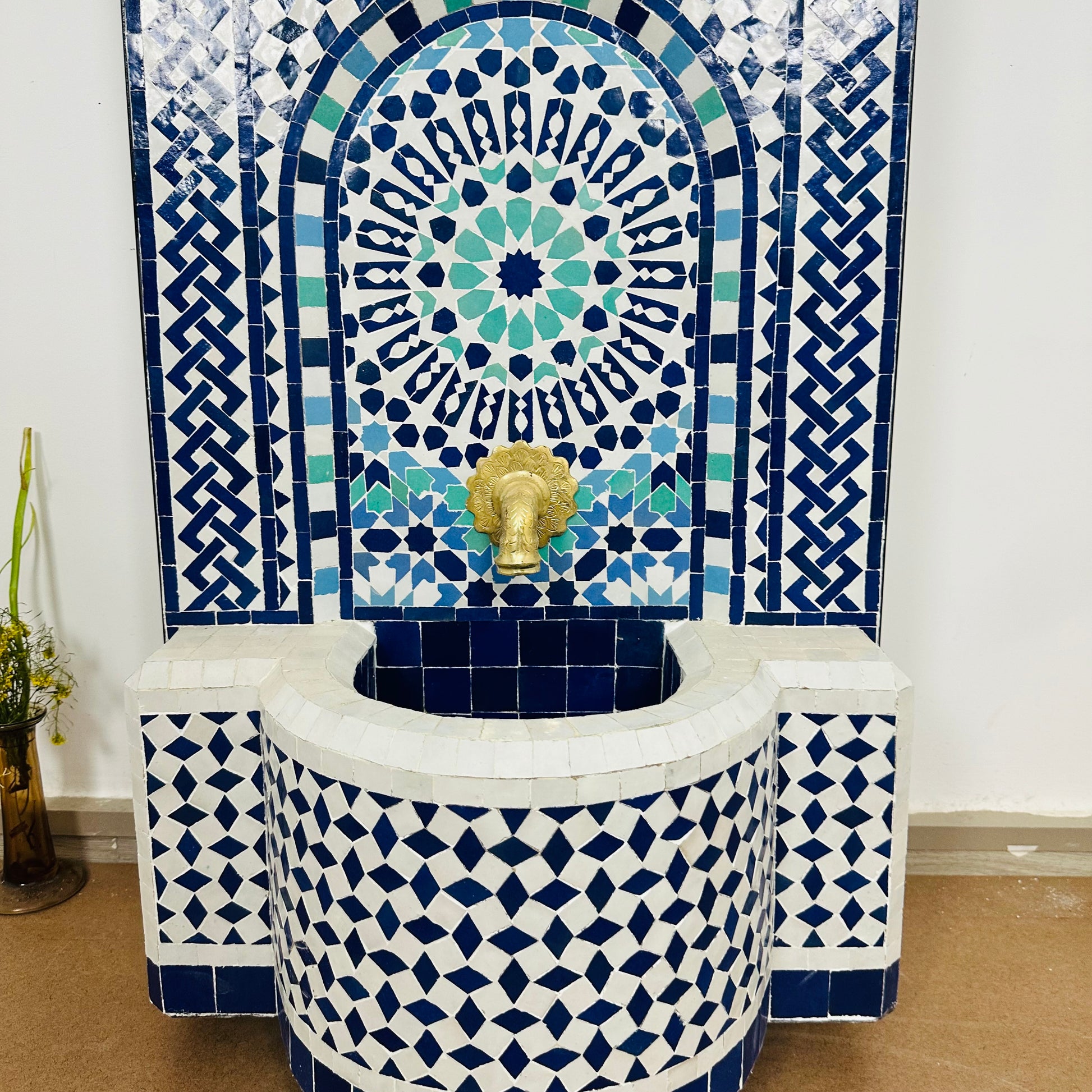 This stunning Moroccan Zellige fountain showcases a classic Moorish geometric design with an elegant blue and white color palette, accentuated by a brass lion head spout. Perfect for indoor or outdoor spaces, it brings a soothing water flow and authentic craftsmanship to your home, patio, or courtyard.