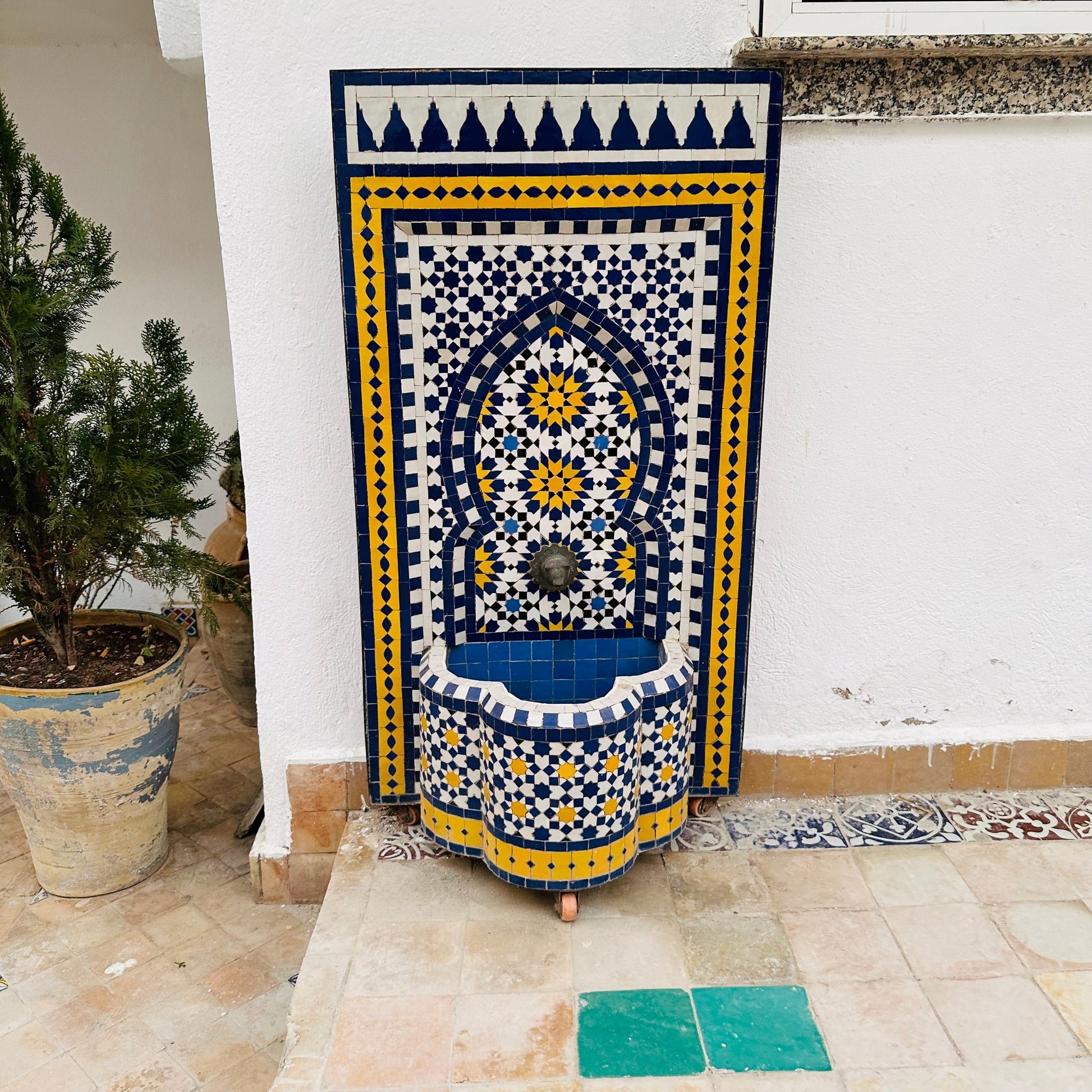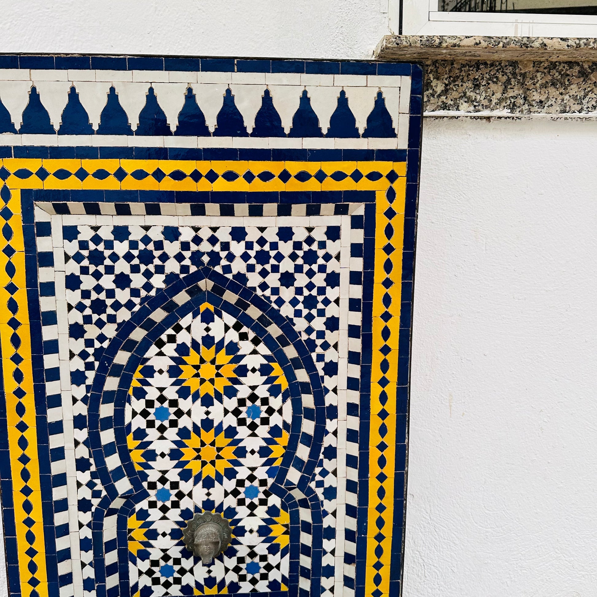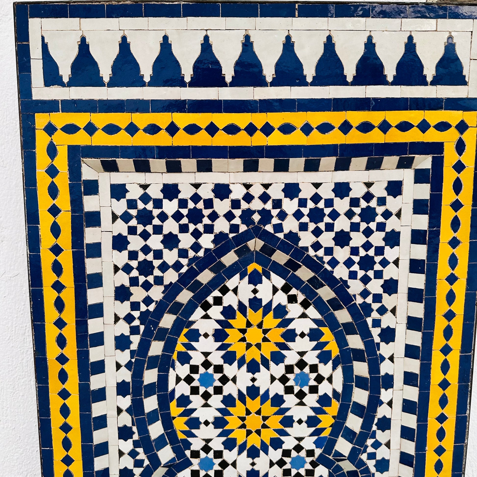 This stunning Moroccan Zellige fountain features a striking blue and yellow mosaic pattern, handcrafted with intricate detail. The geometric starburst design within the arched frame is a hallmark of Moroccan artistry, bringing a blend of tradition and elegance to any space.