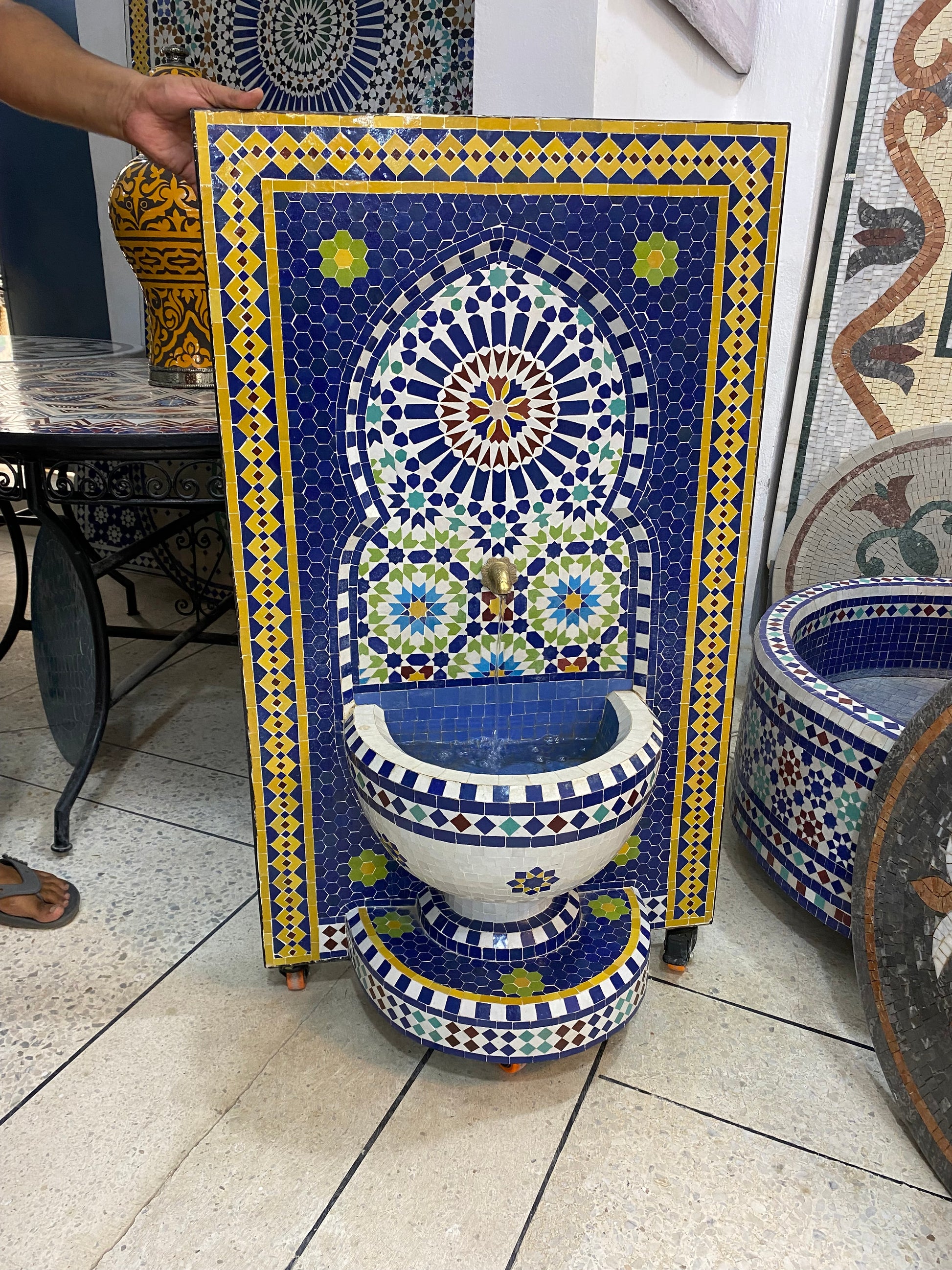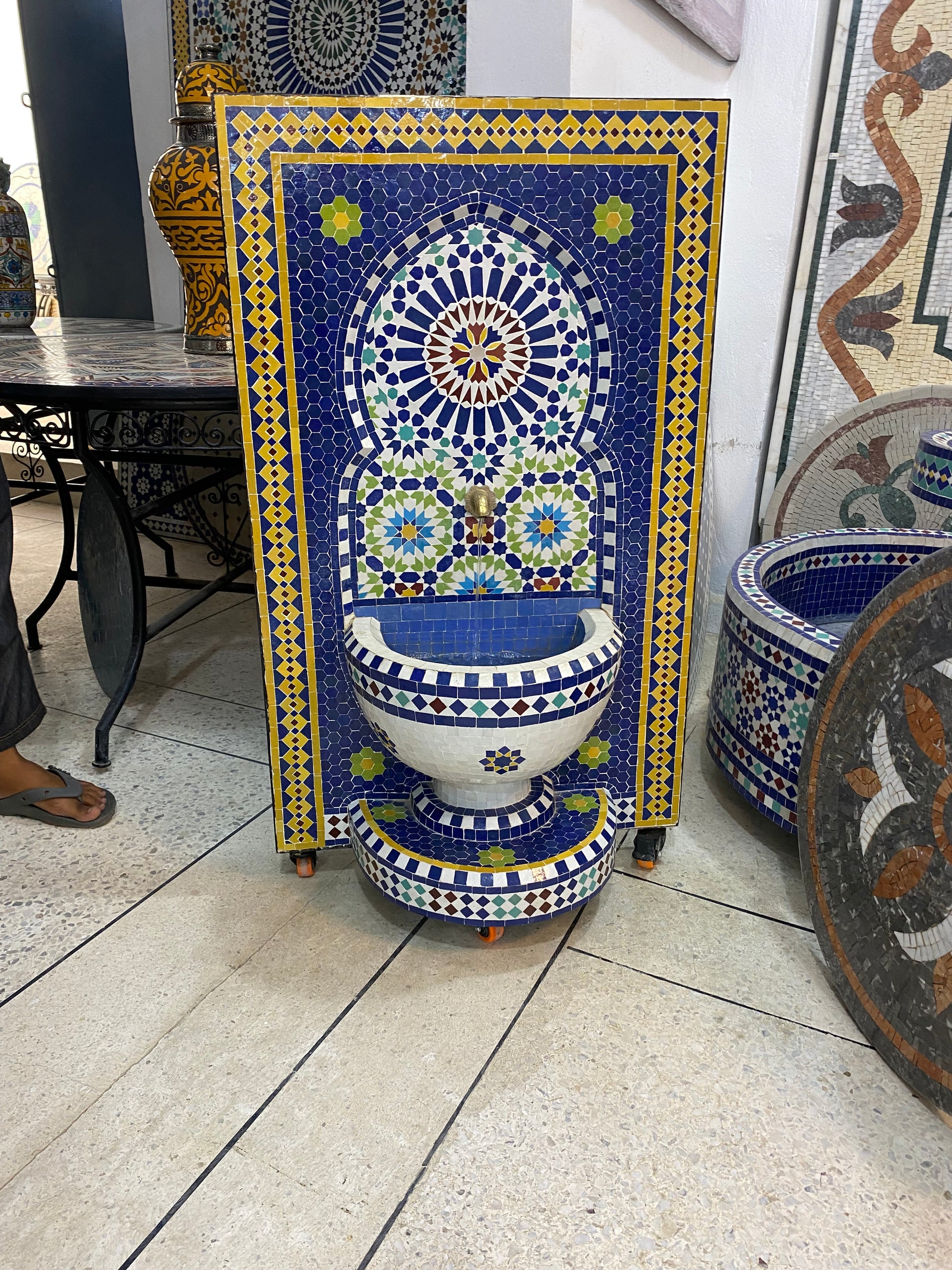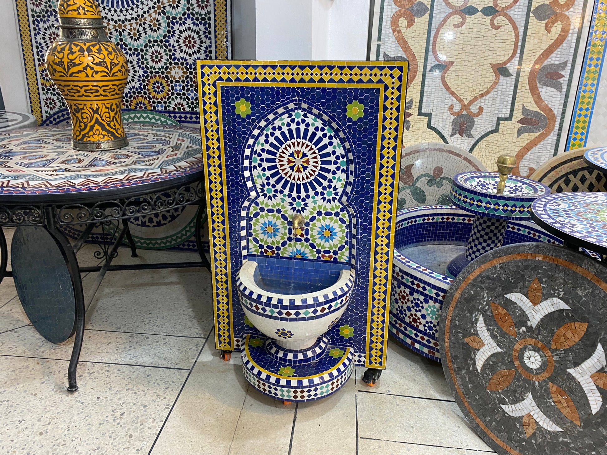 This exquisite Moroccan fountain is a testament to authentic craftsmanship, featuring vibrant Zellige tiles, a majestic Moorish arch, and a striking blue, yellow, and white mosaic pattern. Every tile is hand-cut and meticulously arranged, making it a true work of art.