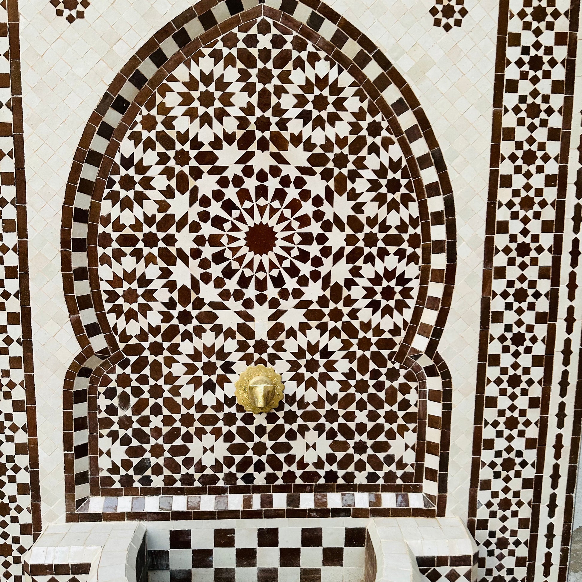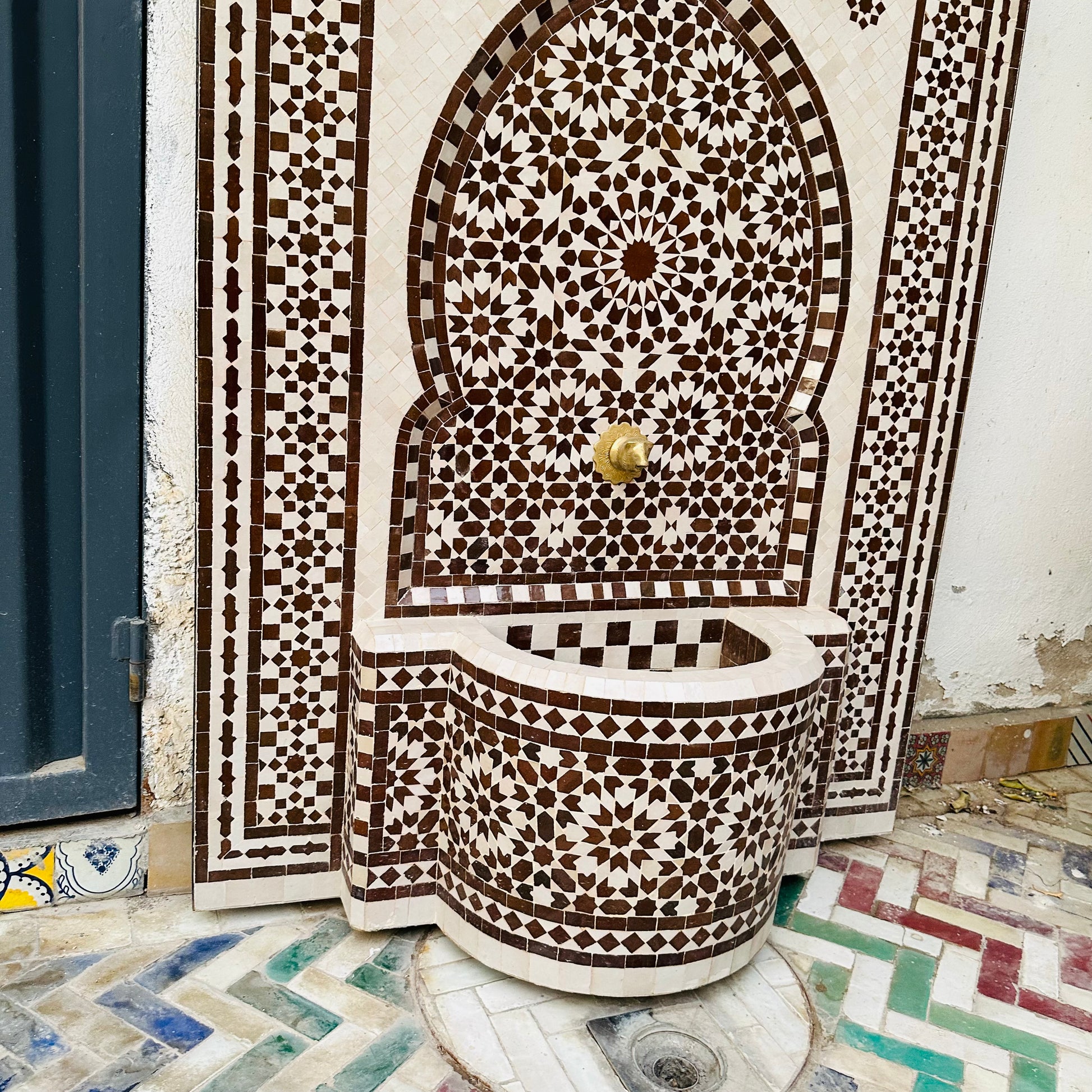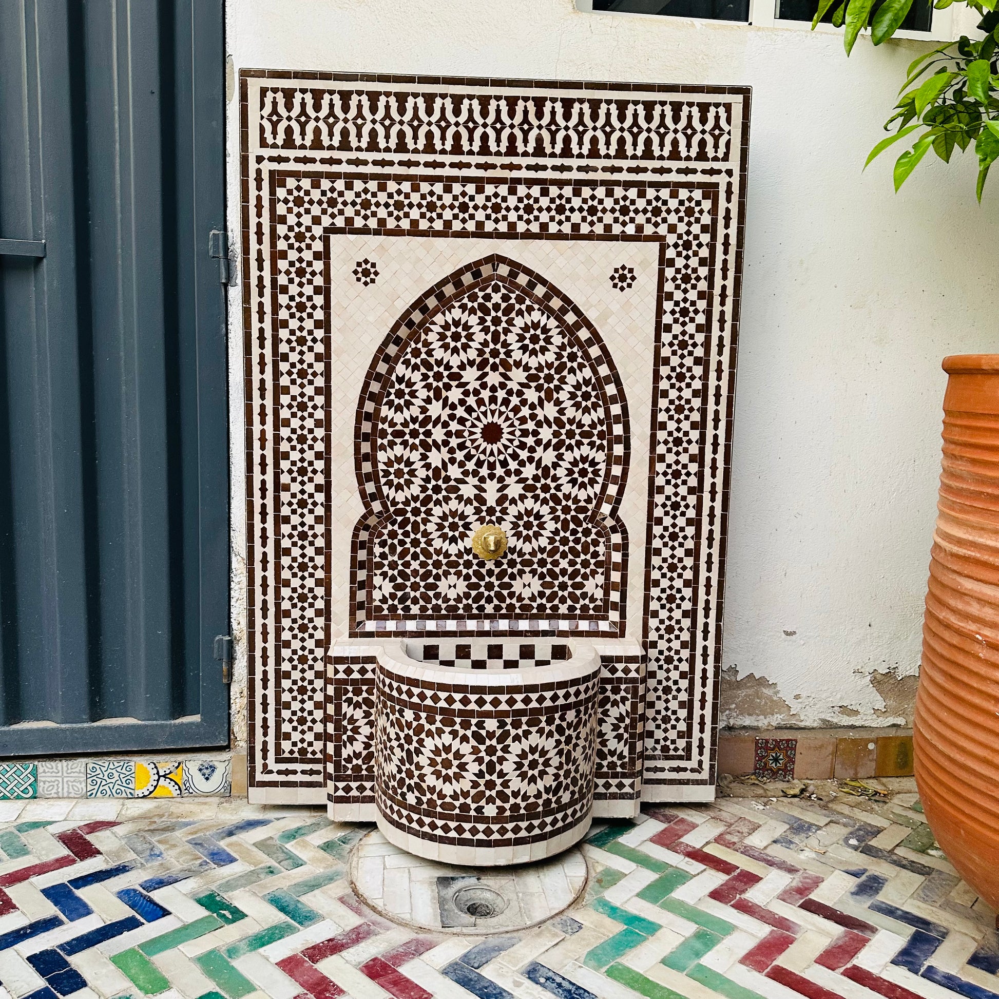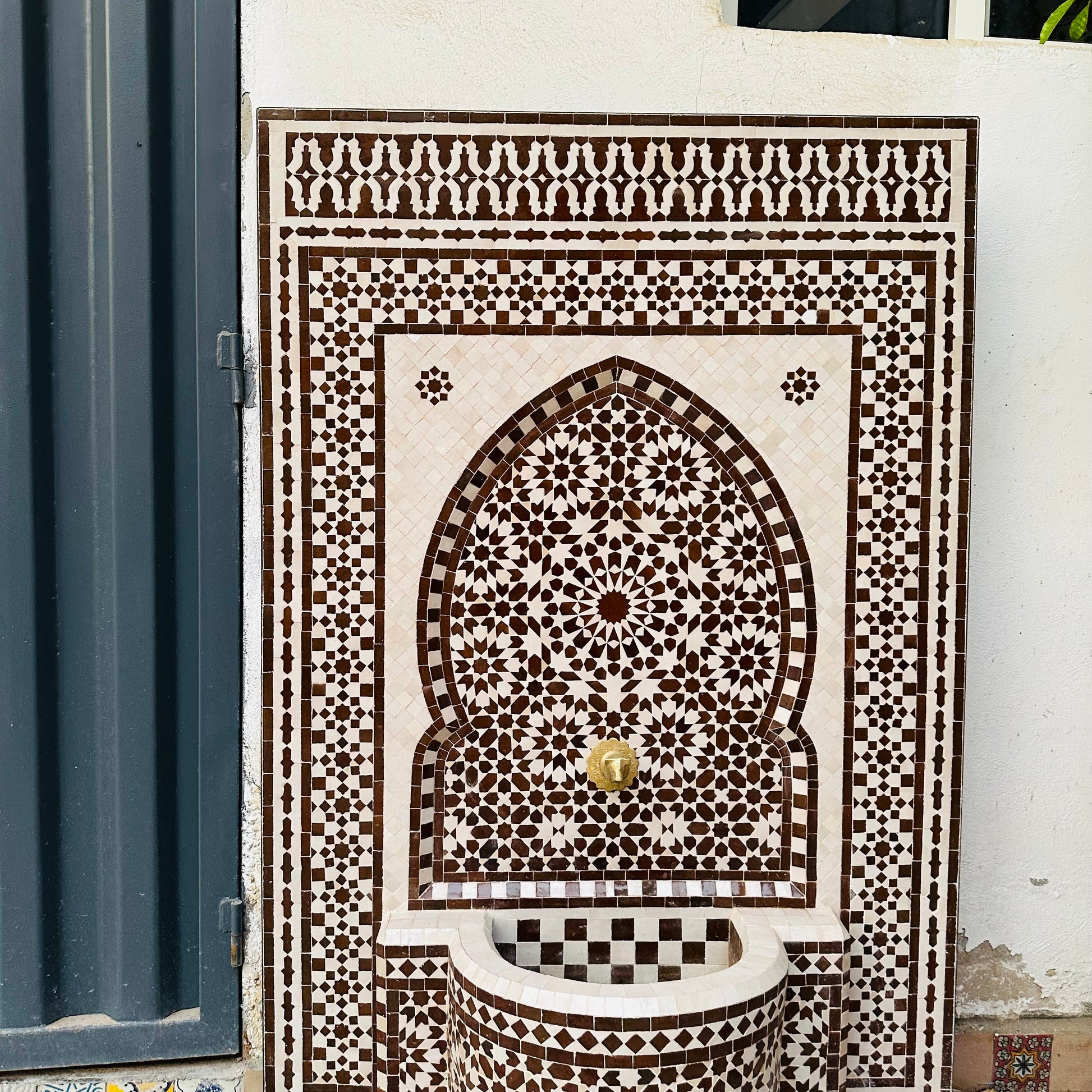 elegant Moroccan Zellige fountain in earthy brown and cream tones