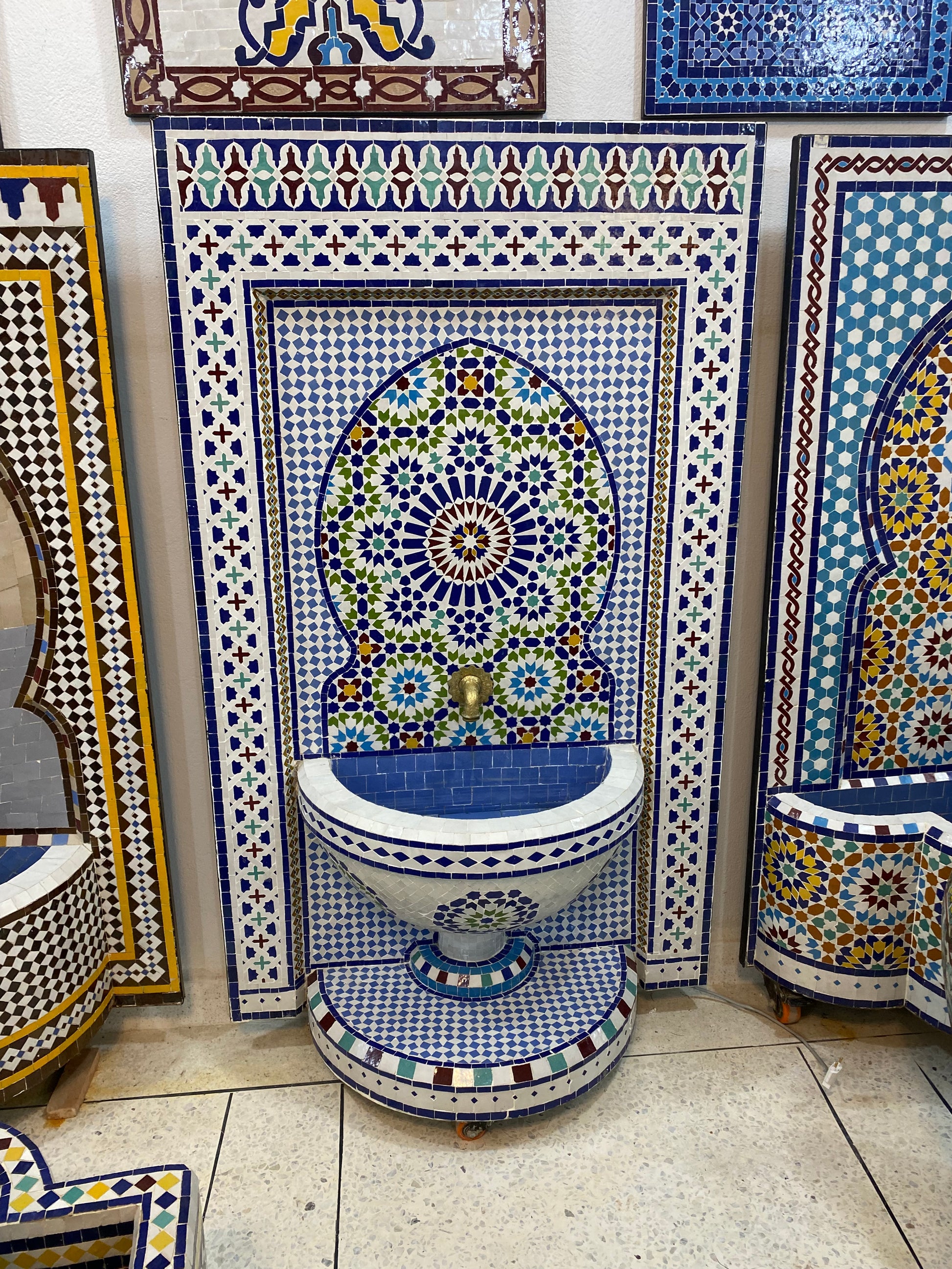 This stunning Moroccan fountain showcases the beauty of traditional Zellige craftsmanship, featuring intricate mosaic tilework in vibrant blue, white, green, and earthy tones. Its Moorish arch design and geometric patterns evoke a sense of timeless elegance.