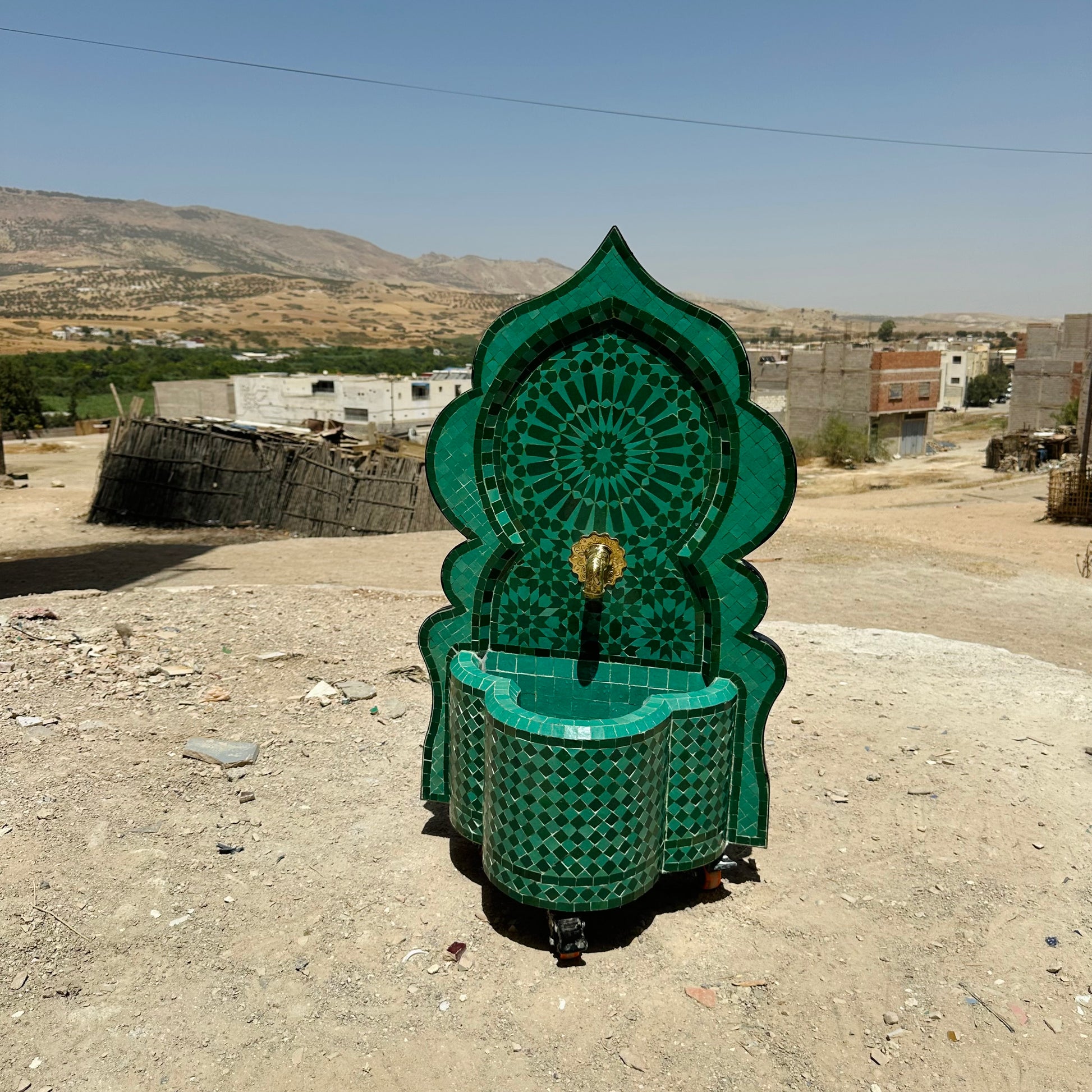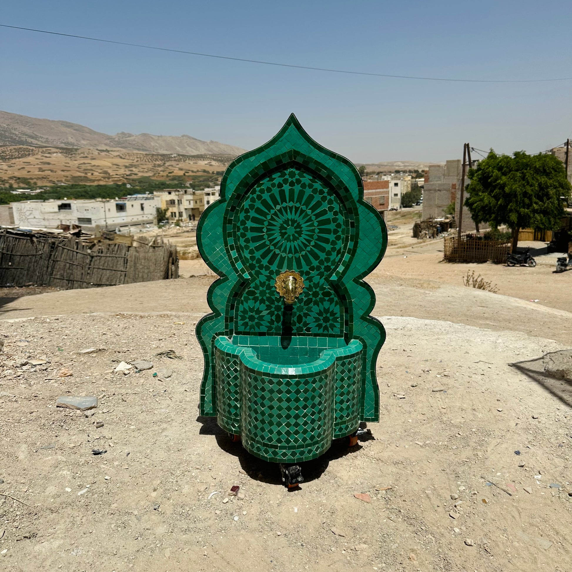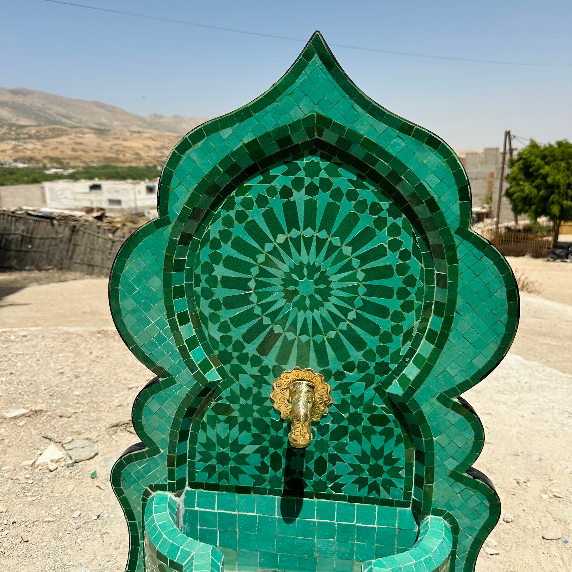 This stunning handcrafted Moroccan fountain is a testament to traditional artistry, featuring an all-green Zellige mosaic in a mesmerizing geometric pattern. The sculpted Moorish arch and ornate brass faucet add a touch of opulence, making it an ideal centerpiece for any space.