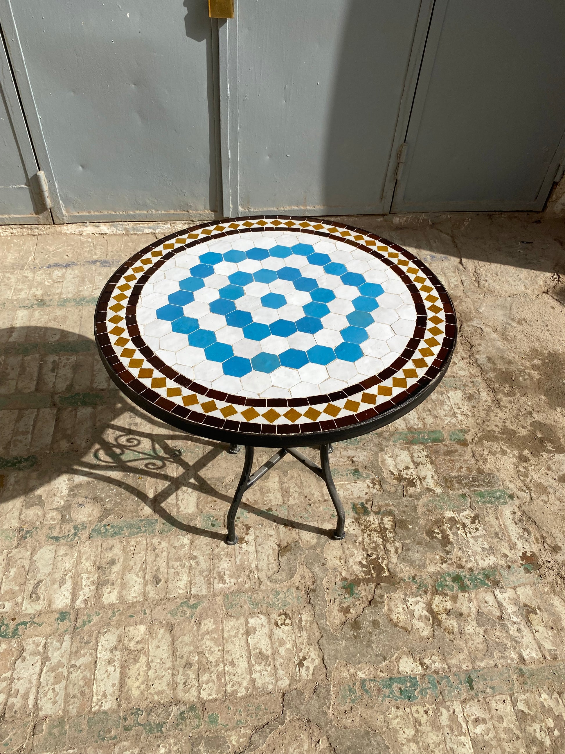 Embrace the timeless beauty of Moroccan artistry with the Blue Spiral Mosaic Table. This stunning piece features an intricate hexagonal pattern that forms a mesmerizing spiral, blending serene shades of sky blue and crisp white. The elegant border, highlighted with golden and chocolate brown accents, adds a touch of warmth and refinement. Handcrafted by skilled artisans, this table is a statement piece that brings elegance and charm to any space.