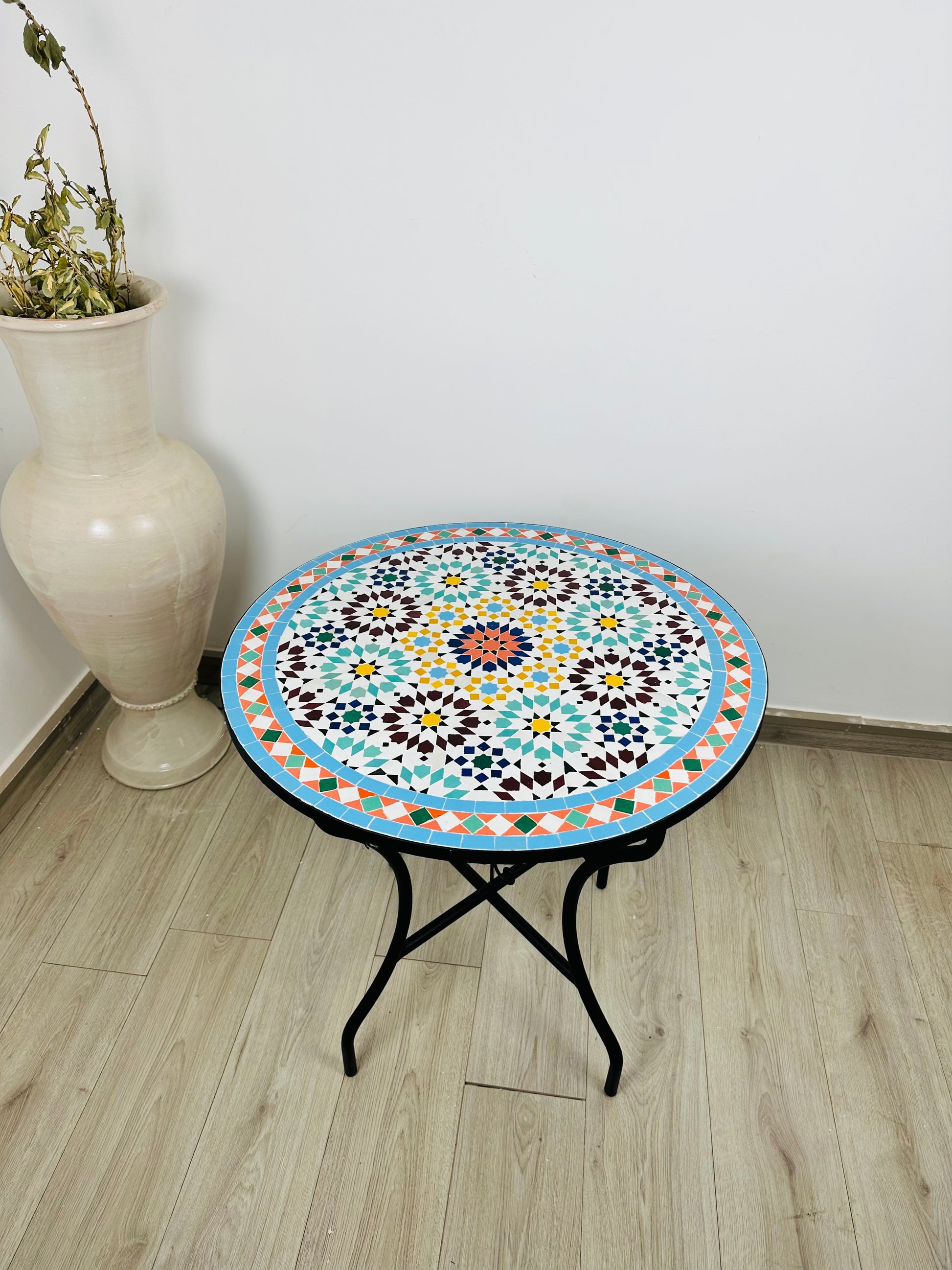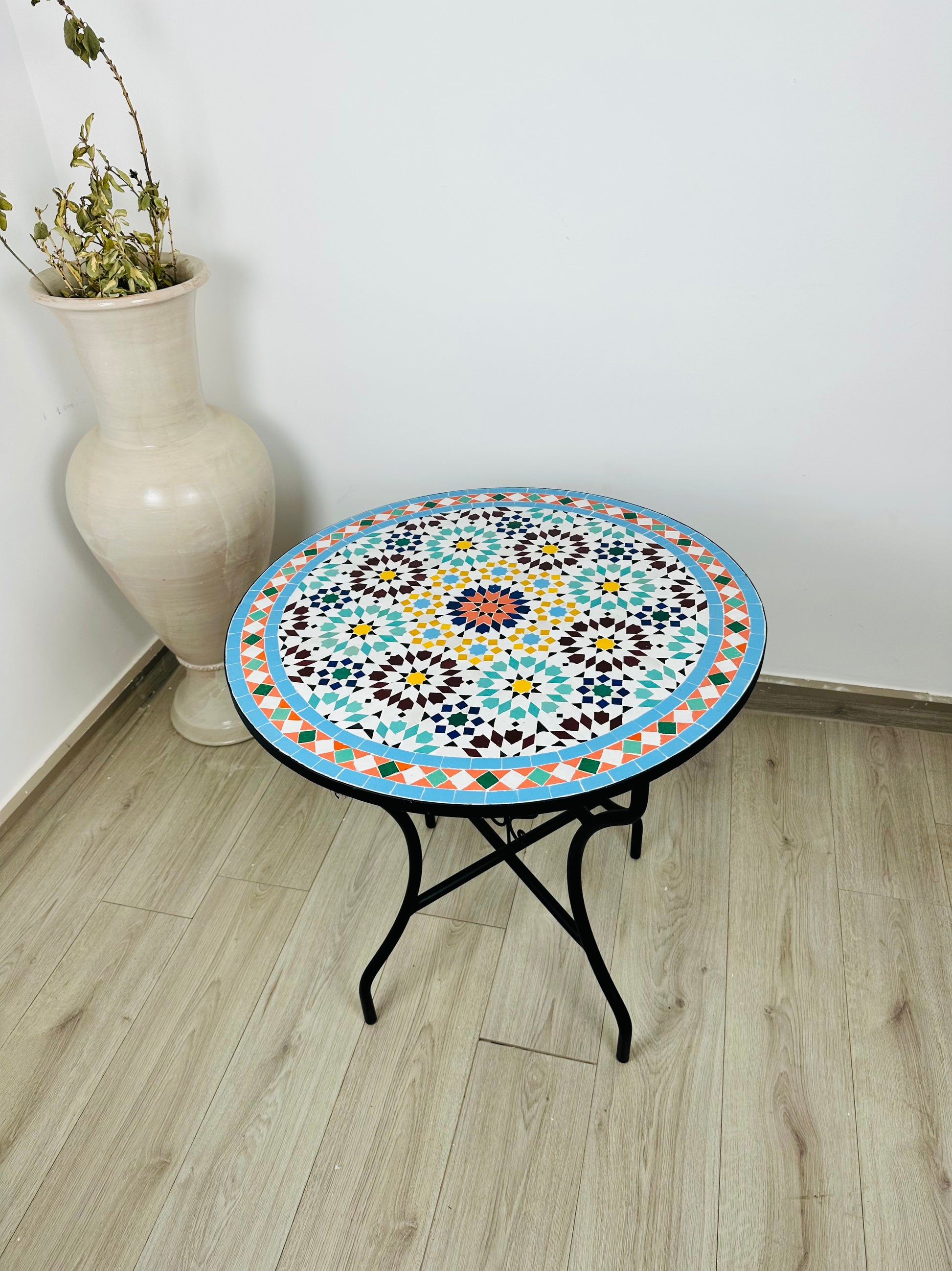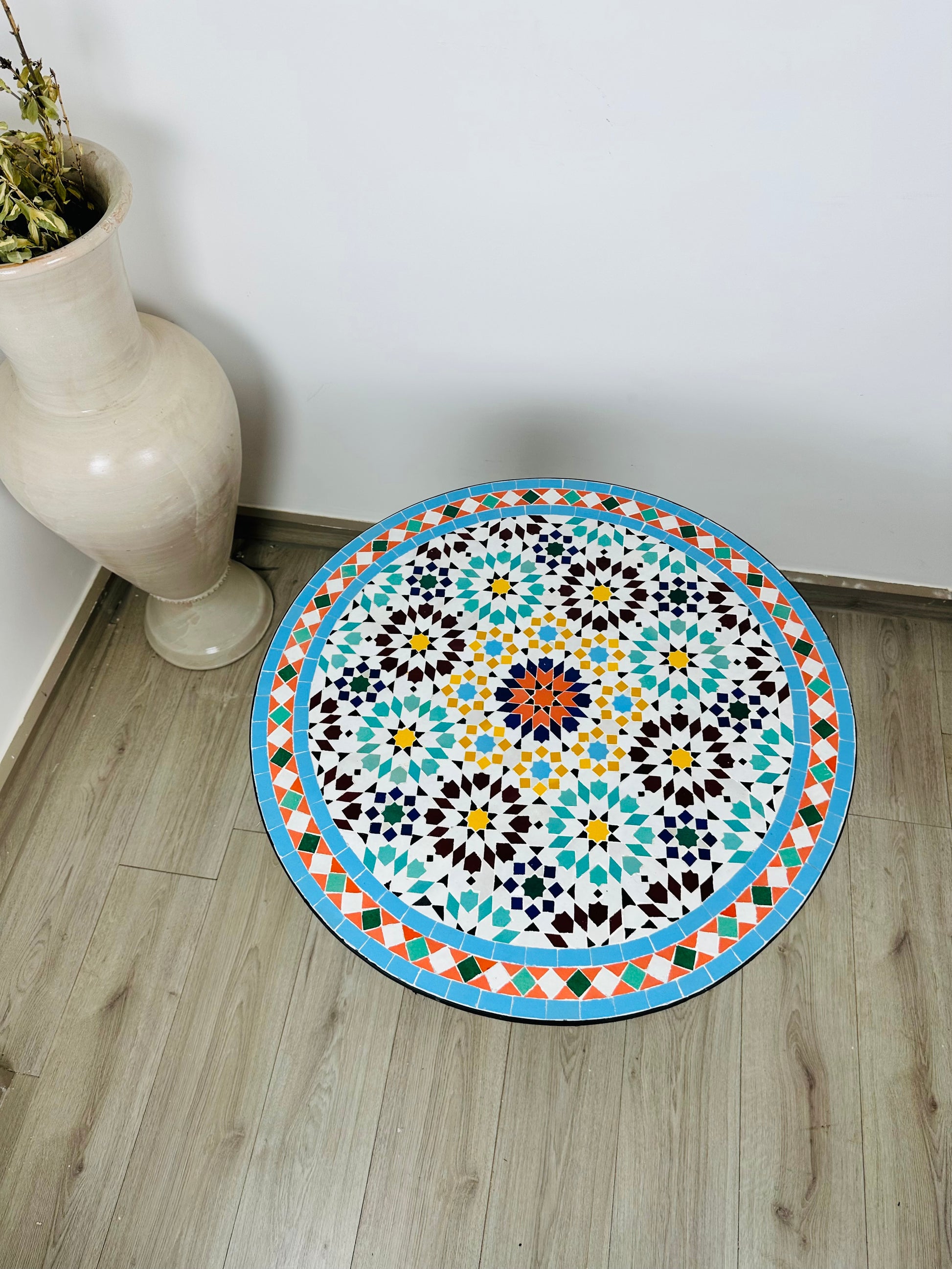 Infuse your space with the vibrant energy and intricate beauty of the Celestial Harmony Mosaic Table. Inspired by traditional Moroccan artistry, this table showcases a radiant starburst pattern at its core, surrounded by a mesmerizing interplay of turquoise, amber, deep burgundy, and crisp white tiles. The outer border, adorned with geometric accents in warm coral and sky blue, frames the design perfectly, adding a dynamic contrast that captivates the eye.