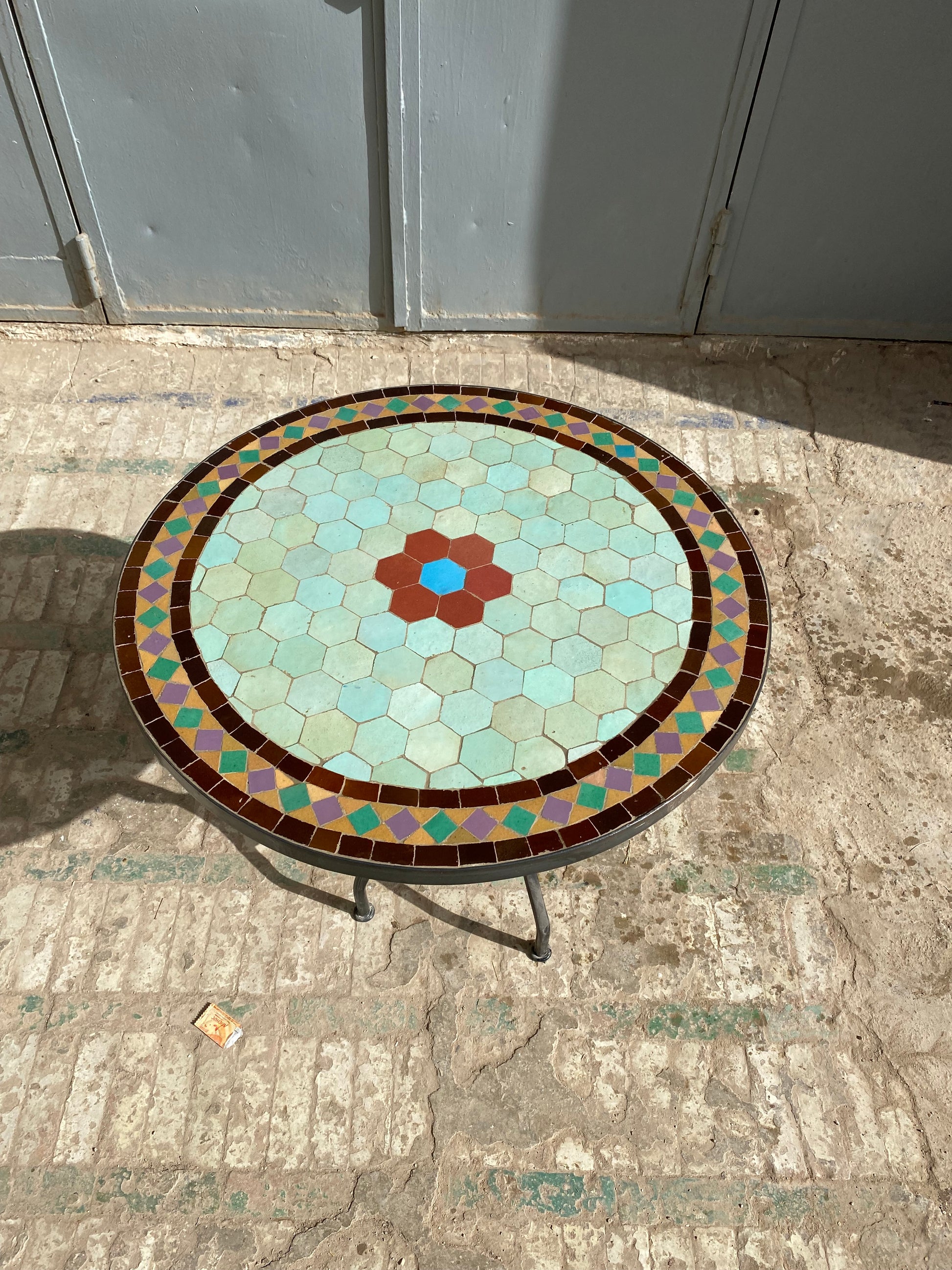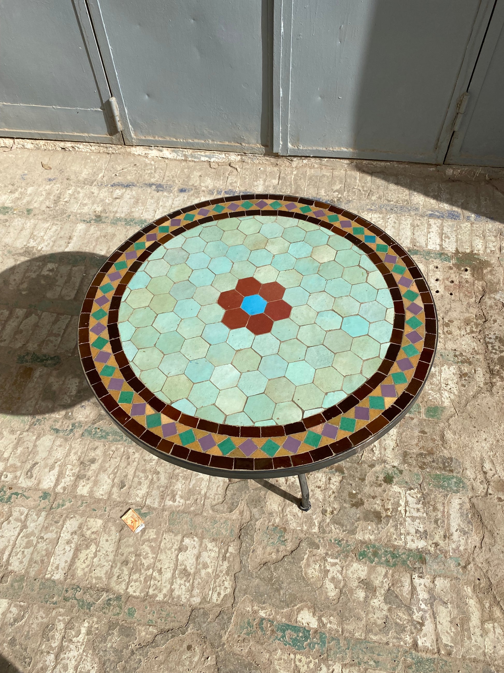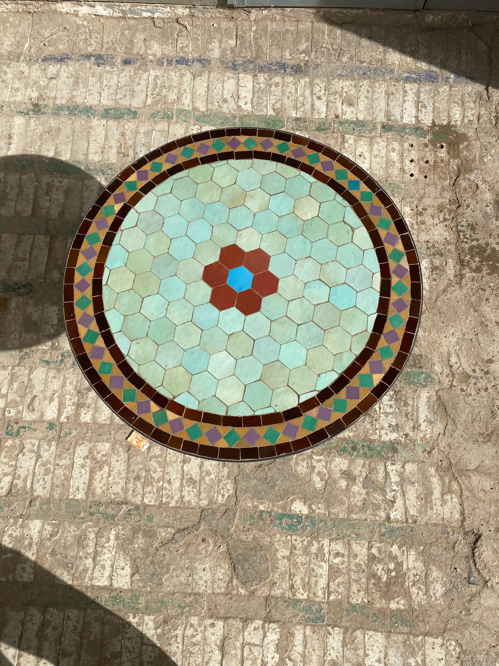 A delicate blend of soft mint green hues and warm earth tones, the Serene Mint Green Mosaic Table brings a calming elegance to any indoor or outdoor setting. The hexagonal tiles form a harmonious pattern, centered around a subtle red and blue floral motif, while the multicolored border adds vibrancy and charm.