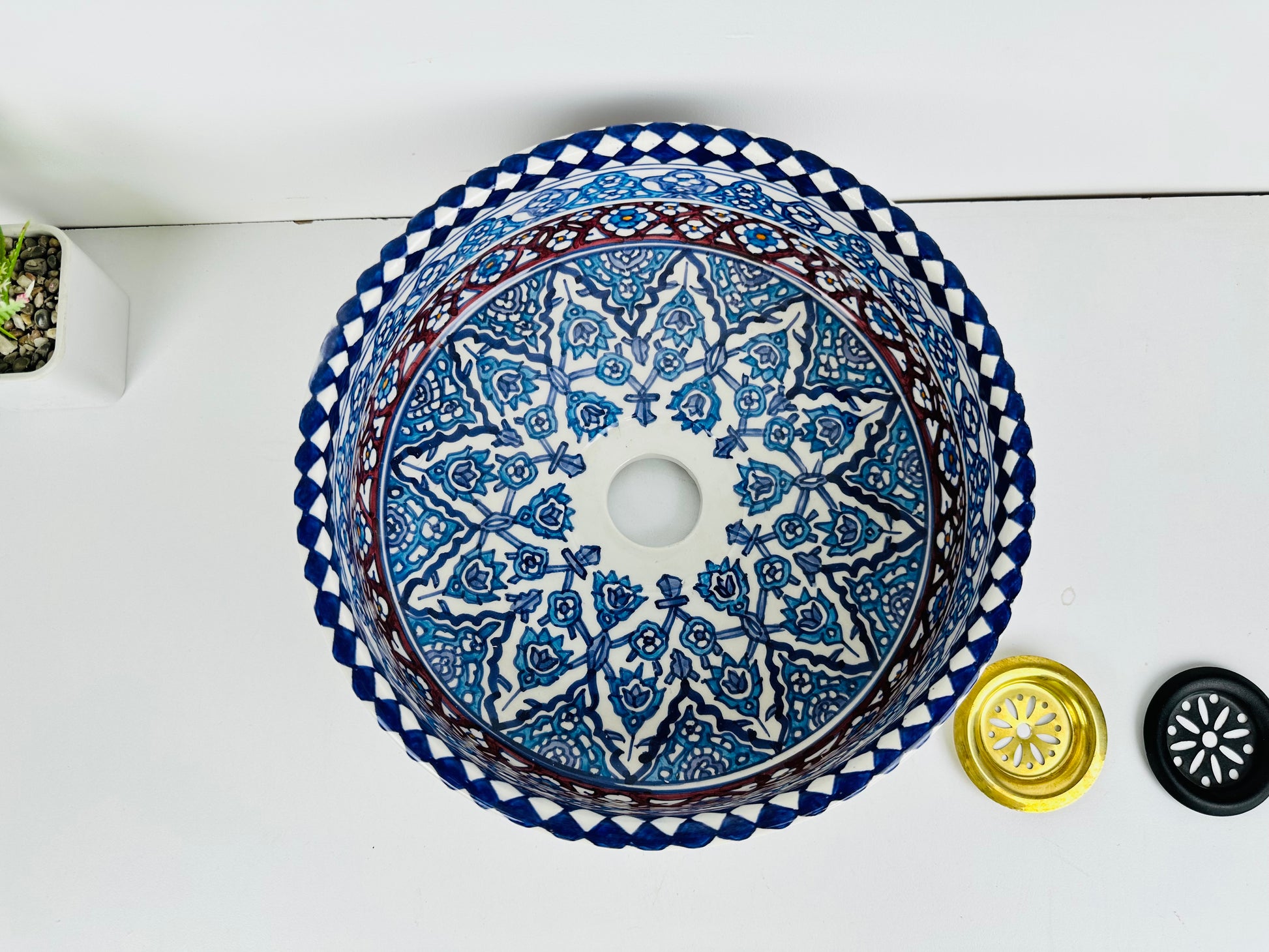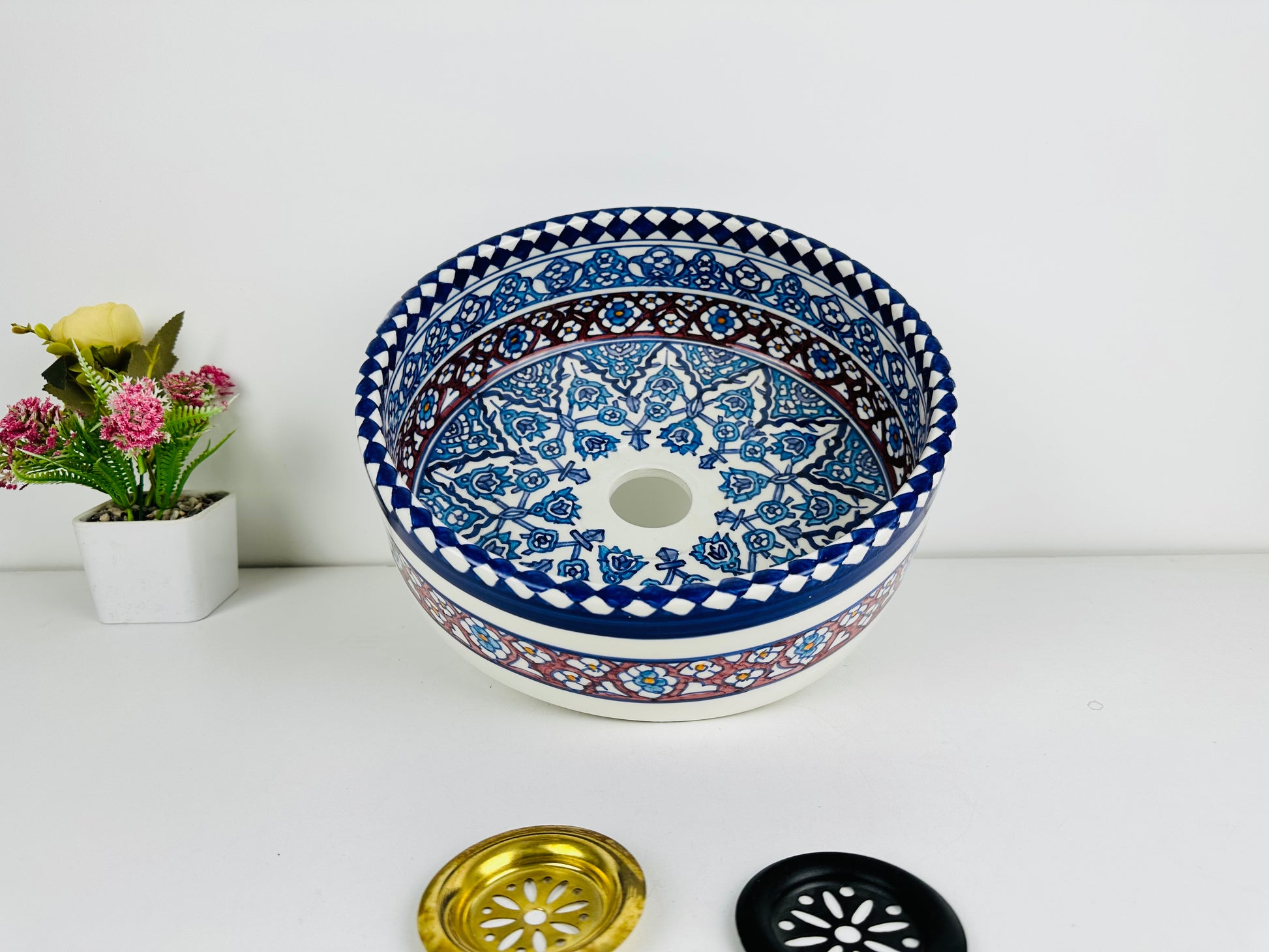 Crimson Oasis: Handcrafted Ceramic Sink with Red and Blue Moroccan Design